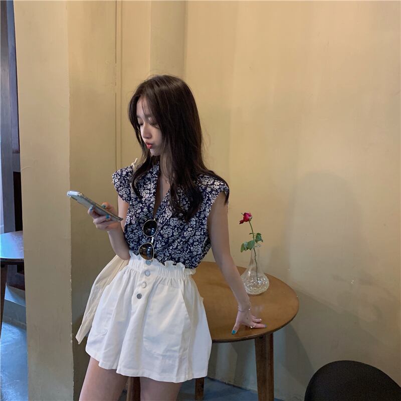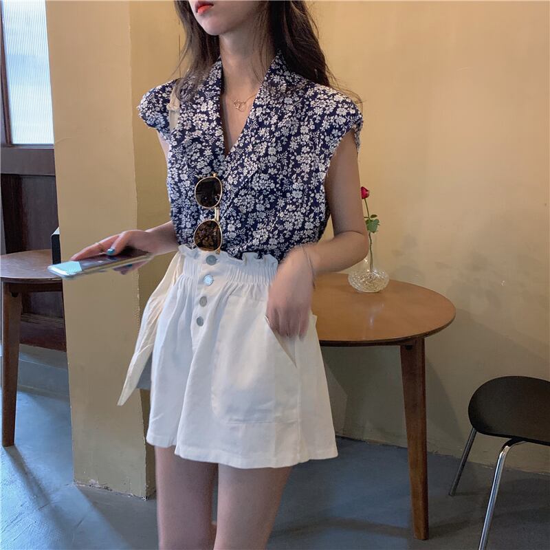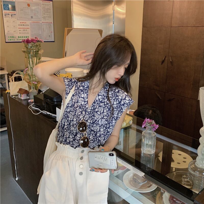 【韓国通販 dgo】女性 夏 2020 ノースリーブ フローラル シフォンシャツ+ハイウエスト ワイドレッグパンツ ツーピース 本当に欲しいセットアップ(A1245)