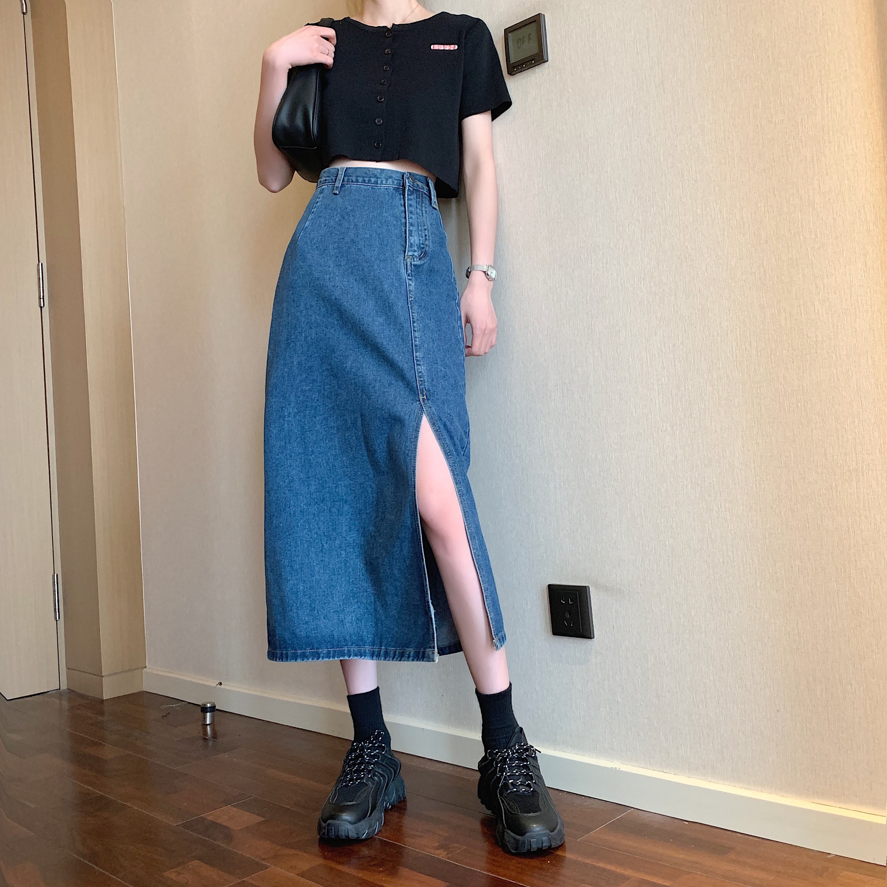 【韓国通販 dgo】ミディアム丈 スプリット スカート 夏 2020 ロングスカート ハイウエスト デニム 着回し力抜群なスカート(A1237)