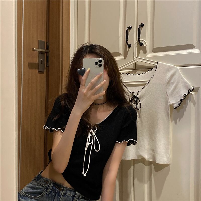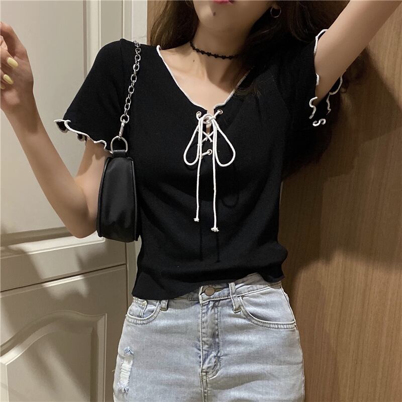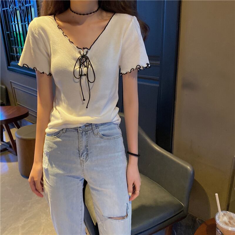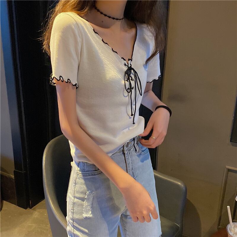 【韓国通販 dgo】ショート Vネック ブラウス Tシャツ レディース スリム トップス 2020年 夏 気分高まる♪夏のトップス(A1209)