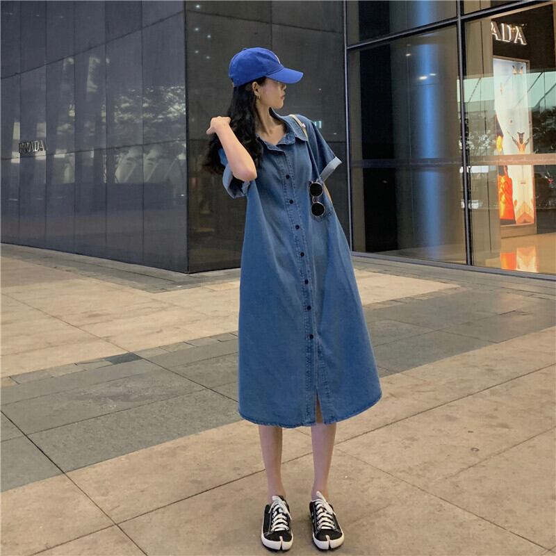 【韓国通販 dgo】フレンチレトロ ミドル丈 膝上デニム ワンピース ドレス 女性 2020年 夏 シングルブレスト 愛らしいワンピース(A1205)