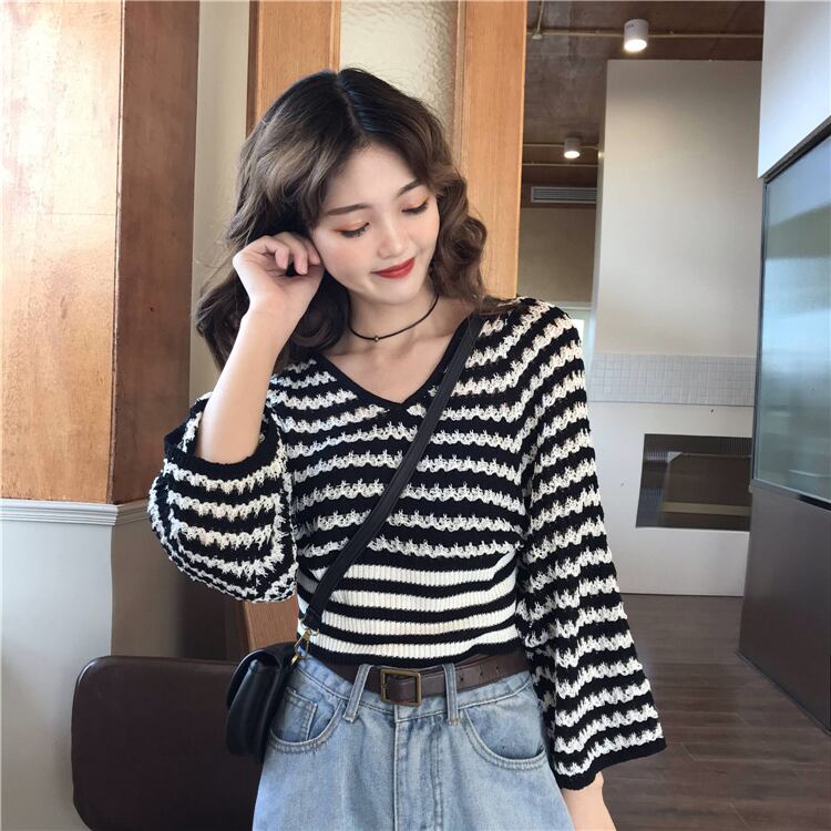 【韓国通販 dgo】ストライプ Vネック セーター 女性 ショートトップス
