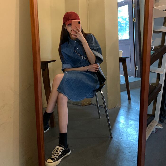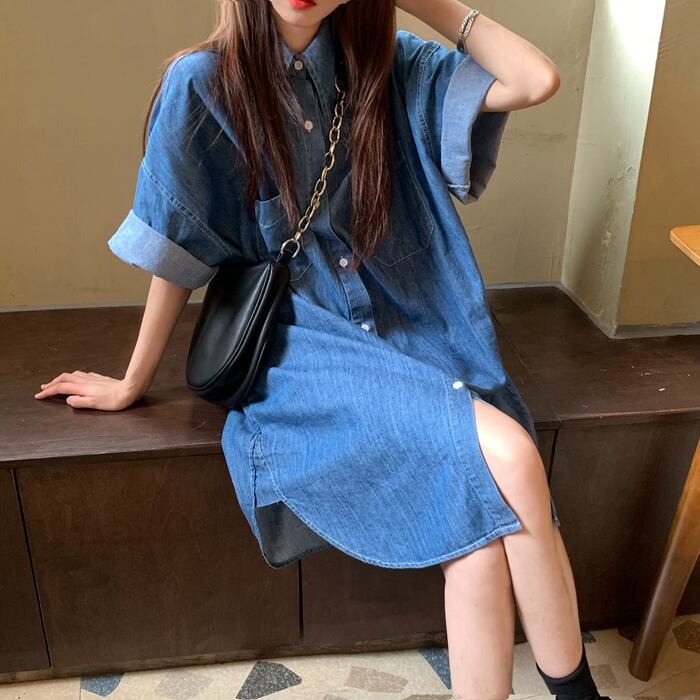 【韓国通販 dgo】ミドル丈 POLO襟 半袖 デニムシャツ 女性 2020年 気分高まる♪夏のトップス