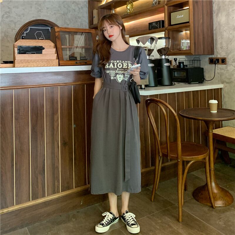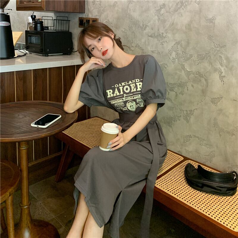 【韓国通販 dgo】ラウンドネック ワンピース ドレス 女性 ウエストスリム ロングスカート グレー(A1899)