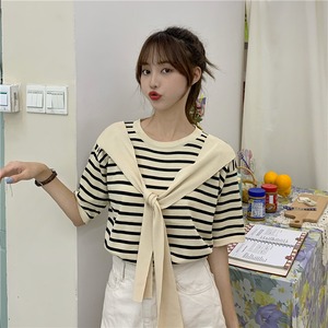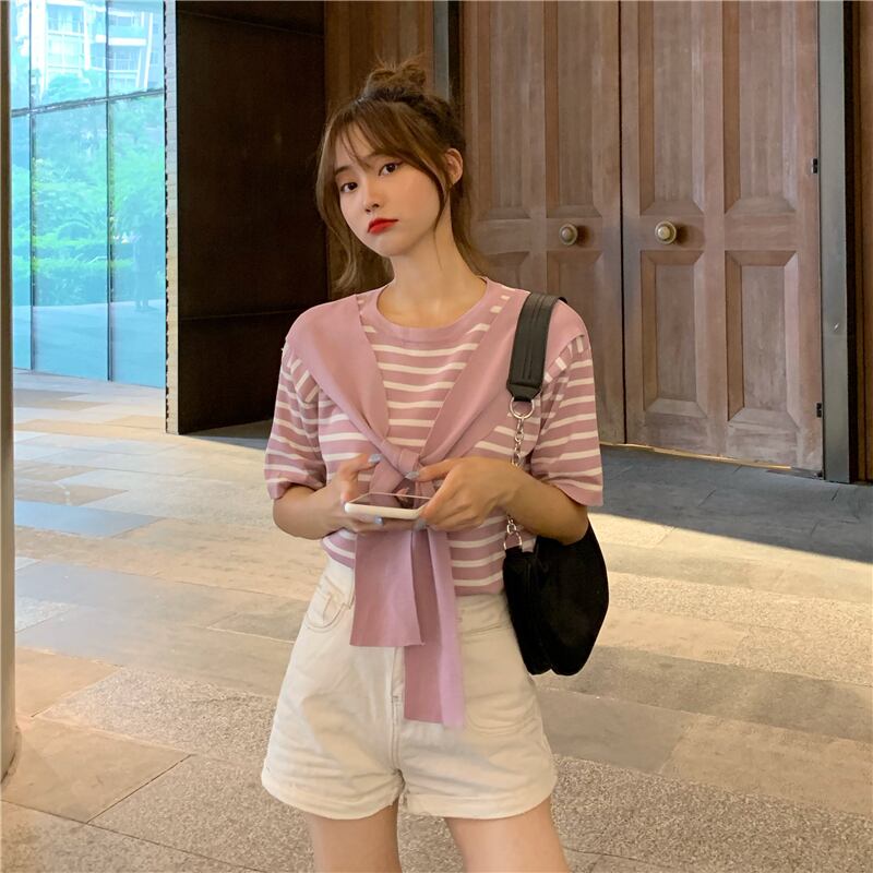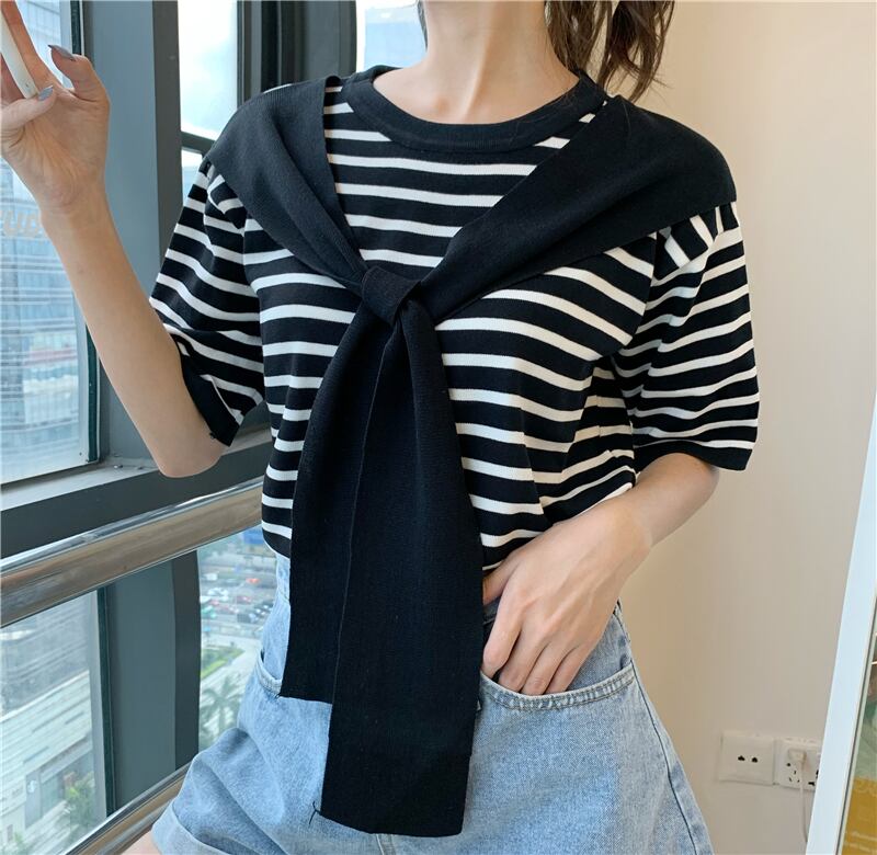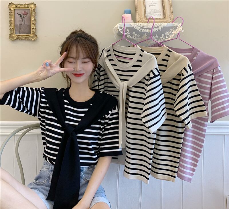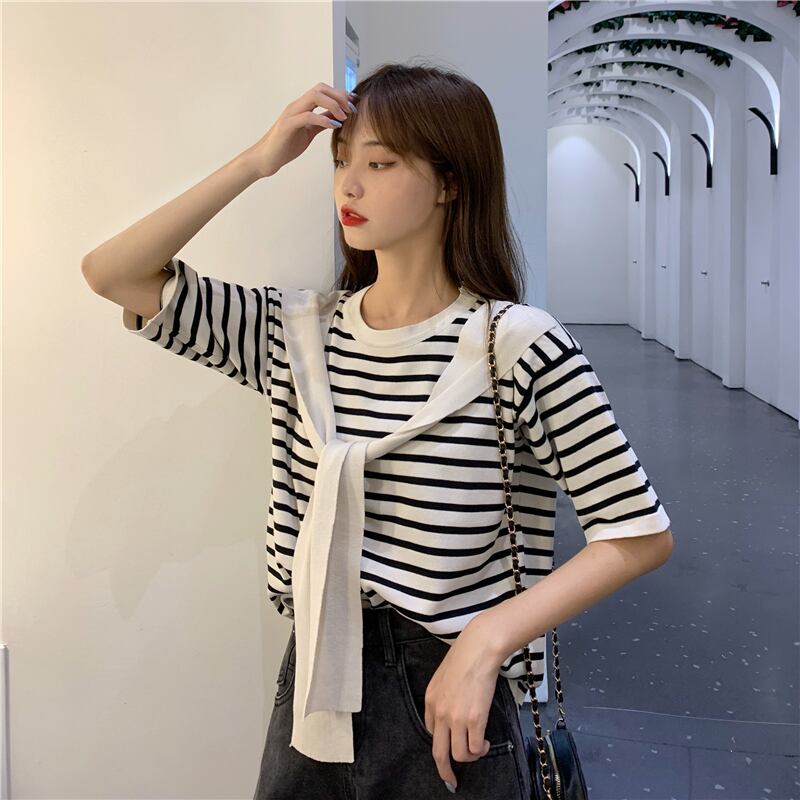 【韓国通販 dgo】ローラウンドネック ショール ストライプ Tシャツ トップ 夏 2020 半袖 セーター 女性(A1827)