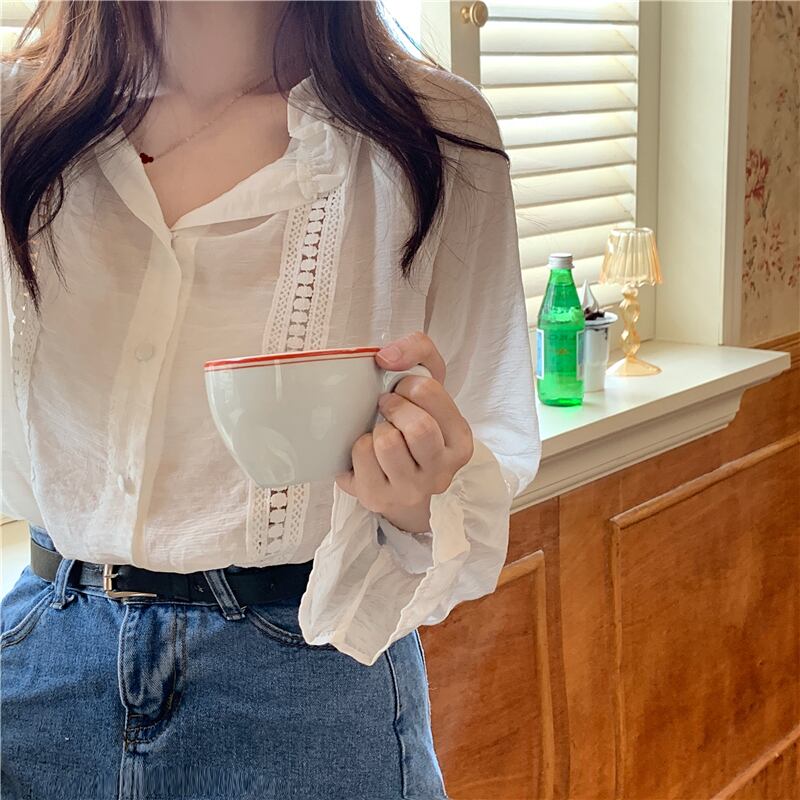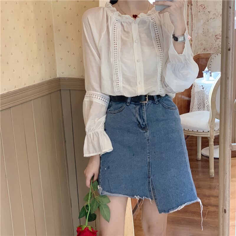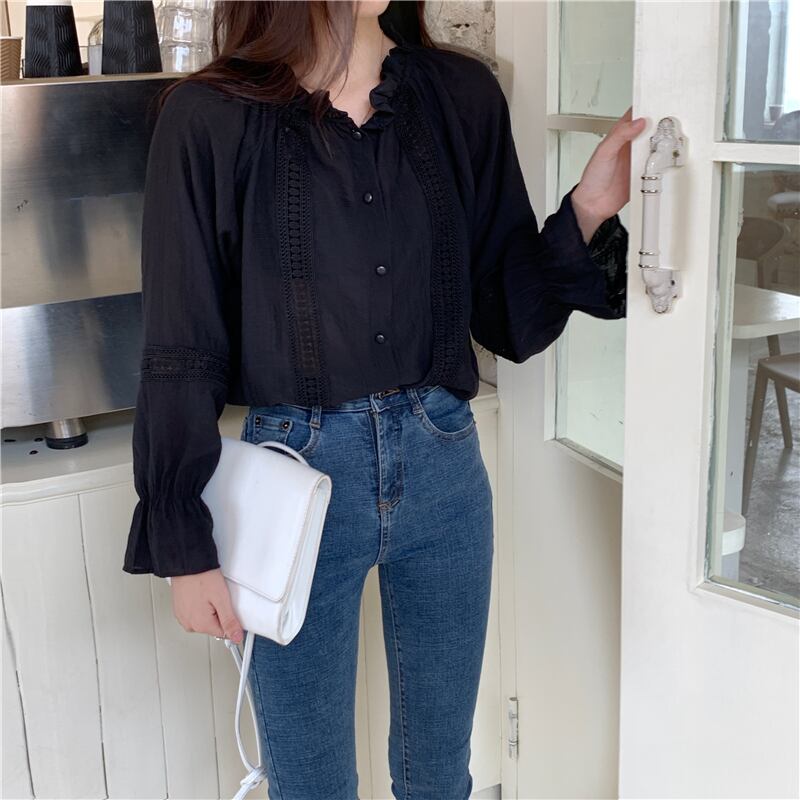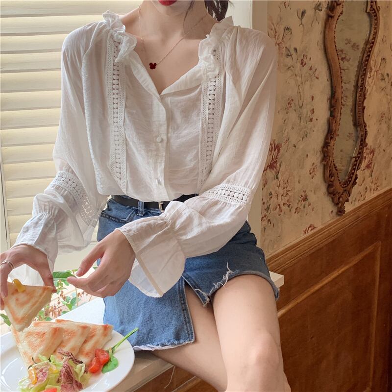 【韓国通販 dgo】ラウンドネック ロータススリーブ ブラウス シャツ 2020 長袖 女性 トレンド 気分高まる♪夏のブラウス(A1769)