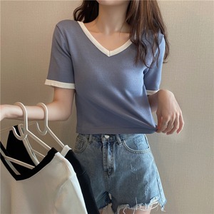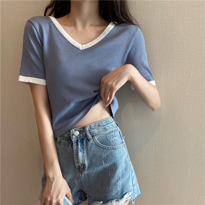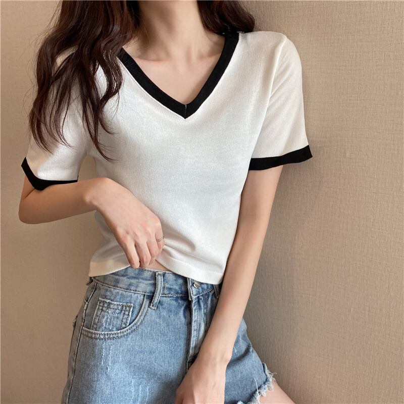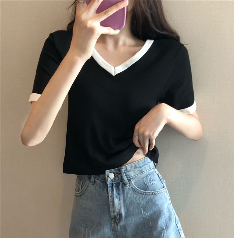 【韓国通販 dgo】フレンチ Vネック スリム ショートトップ 2020 トレンド 半袖 シャツ レディース 一着あると便利なシャツ(A1723)