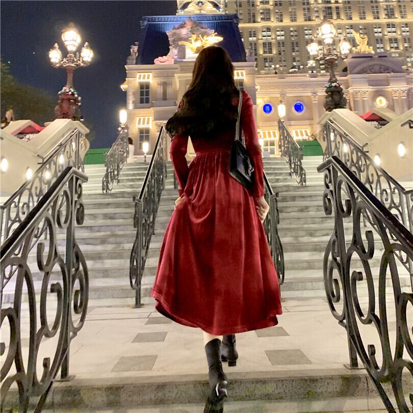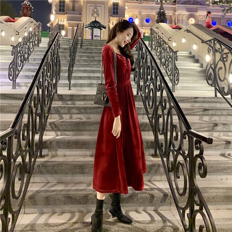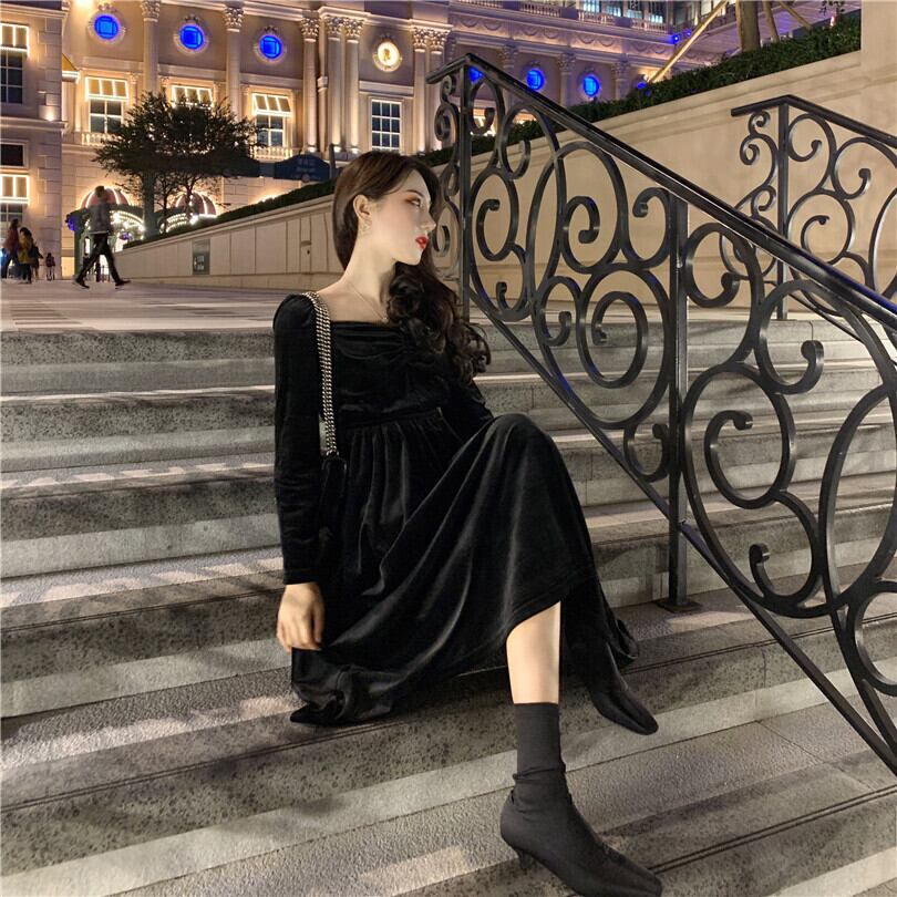 【韓国通販 dgo】2020年 秋 レトロ Vネック ドレス ワンピース レディース Aライン ロングスカート トレンド(A1710)