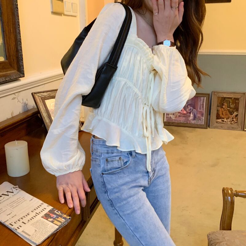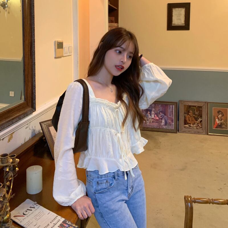 【韓国通販 dgo】ショート丈 スクエアネック パフスリーブ 長袖 レトロ シャツ ブラウス 2020年 夏 秋(A1692)