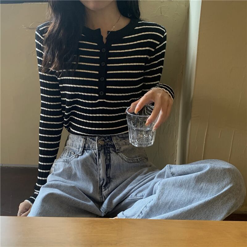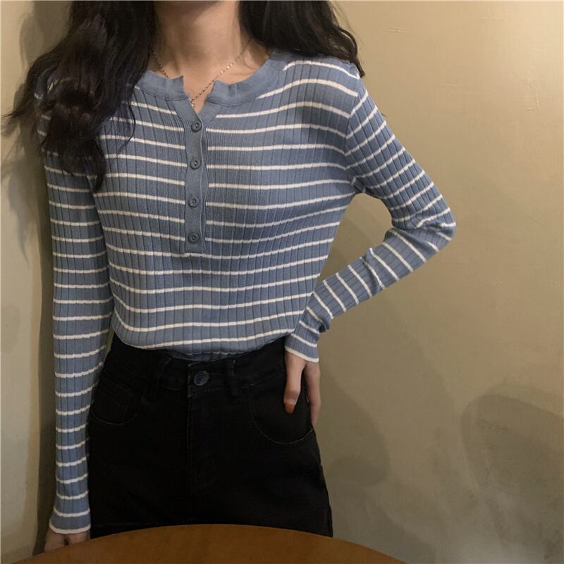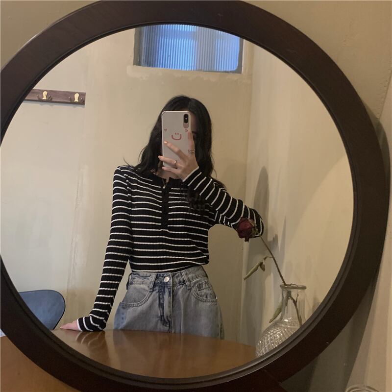 【韓国通販 dgo】2020年 秋 ローラウンドネック スリム 長袖 ストライプ シャツ レディース ハイセンスなシャツが欲しい♪(A1672)