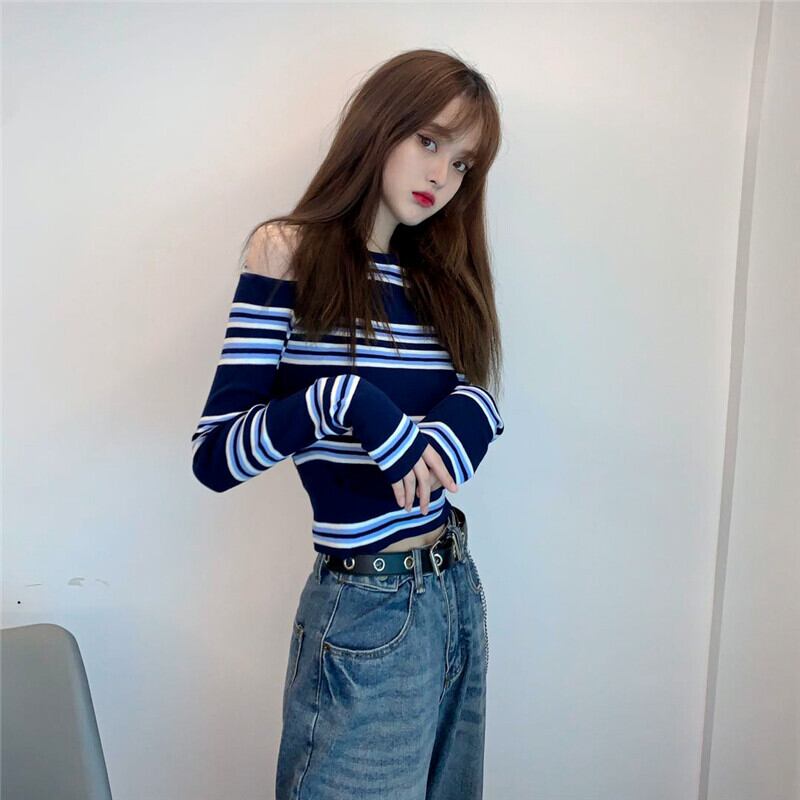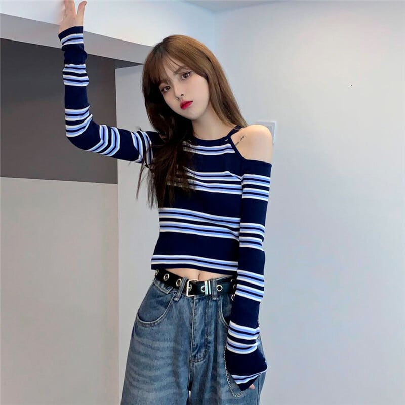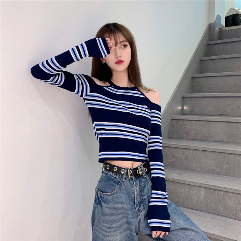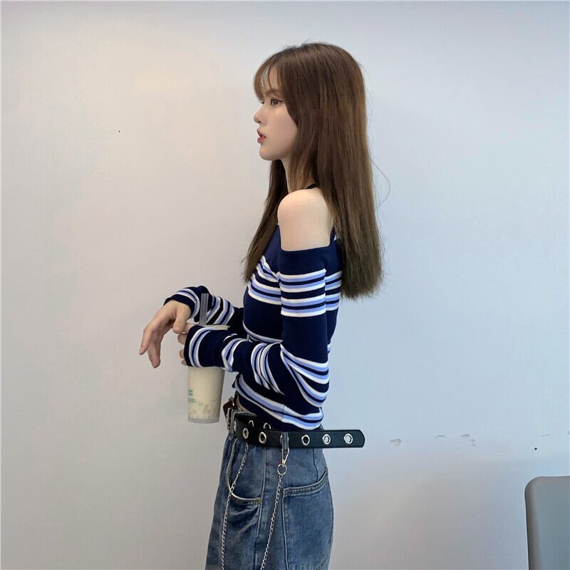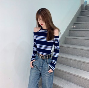 【韓国通販 dgo】2020年 秋 長袖 セーター レディース ストライプ オフショルダー ショートシャツ ハイセンスなシャツが欲しい♪(A1664)