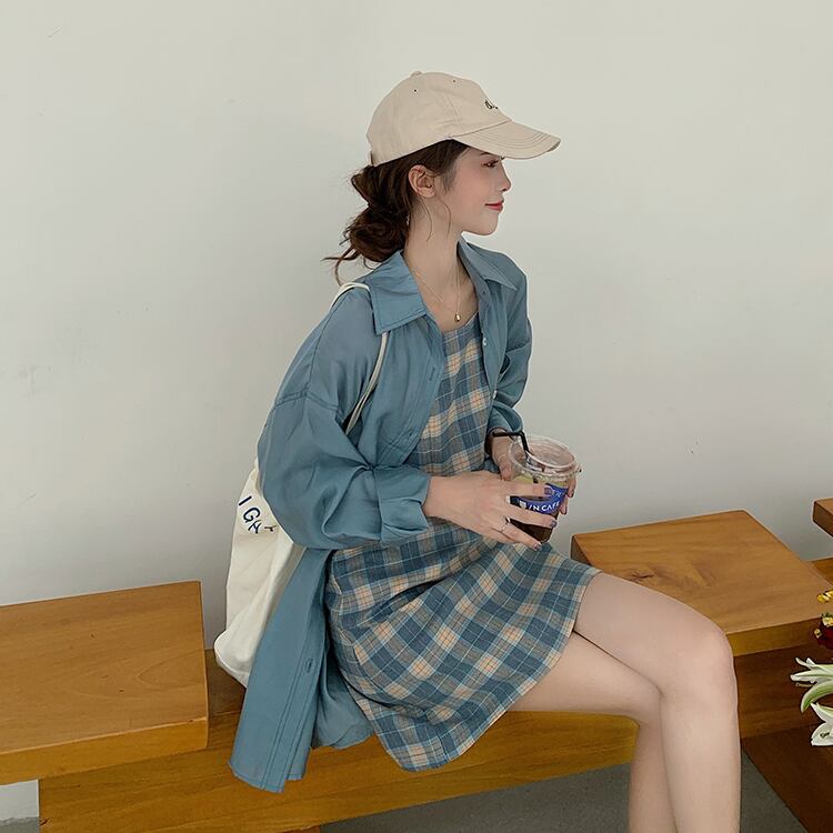 【韓国通販 dgo】レディース 2020年 秋 サスペンダー ワンピース(ブルー 長袖シャツ)(A1643)