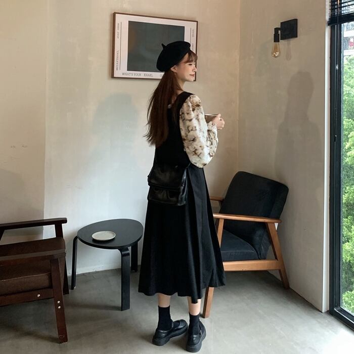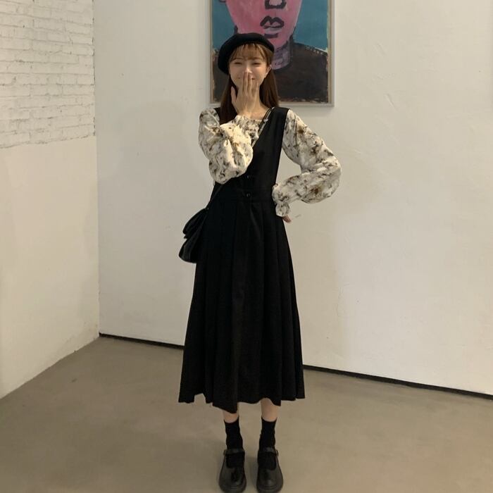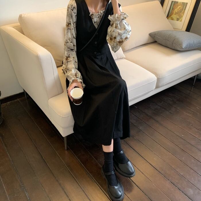 【韓国通販 dgo】black strap one-piece(floral roundneck shirt)(A1477)