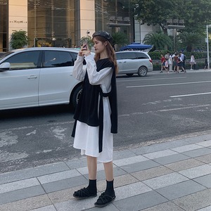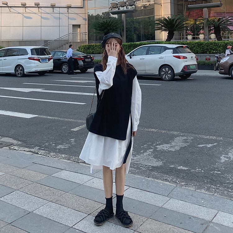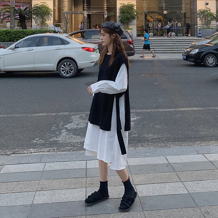 【韓国通販 dgo】middle-length white dress+black vest two-piece(A0276)
