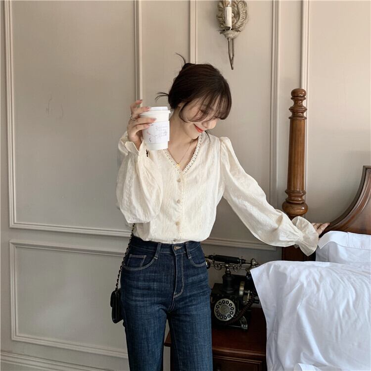 【韓国通販 dgo】v-neck long sleeve blouse apricot color(A1175)
