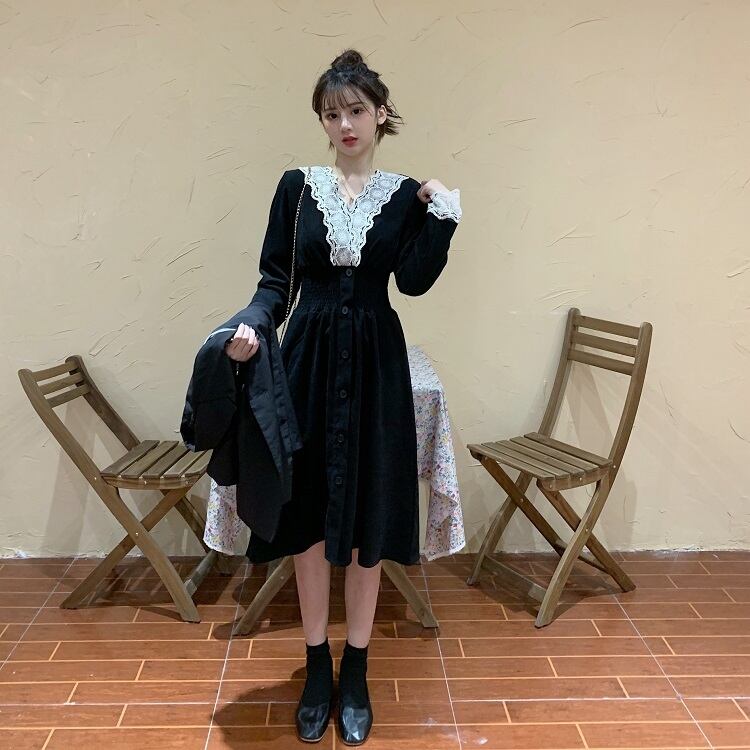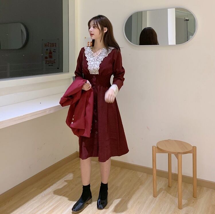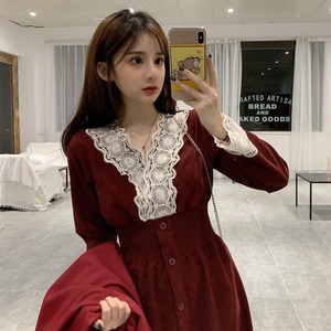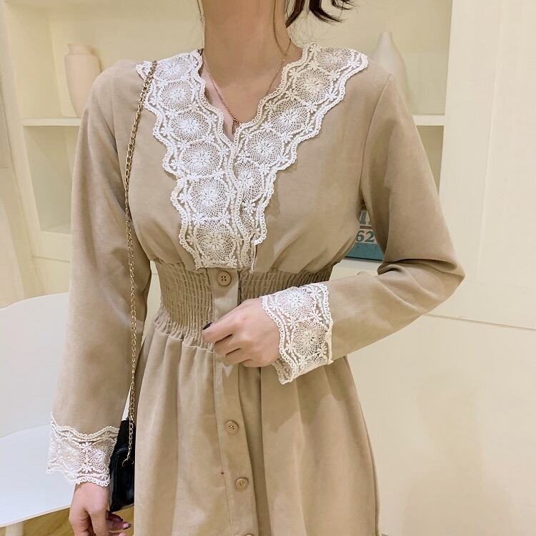 【韓国通販 dgo】v-neck lace stitch one-piece dress 3colors(A1059)