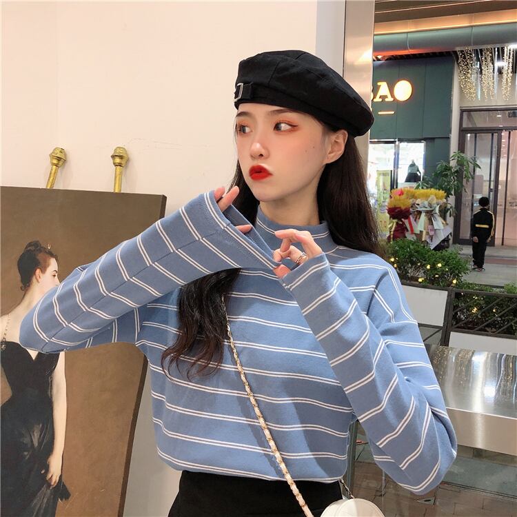 【韓国通販 dgo】half high collar stripe tops 3colors(A1008)