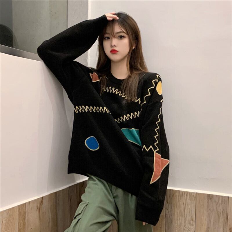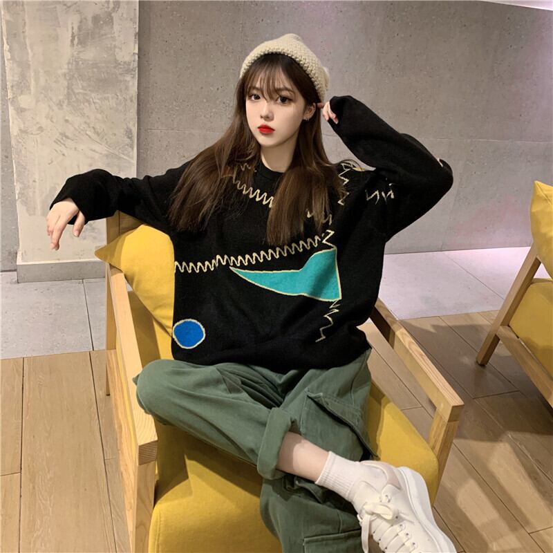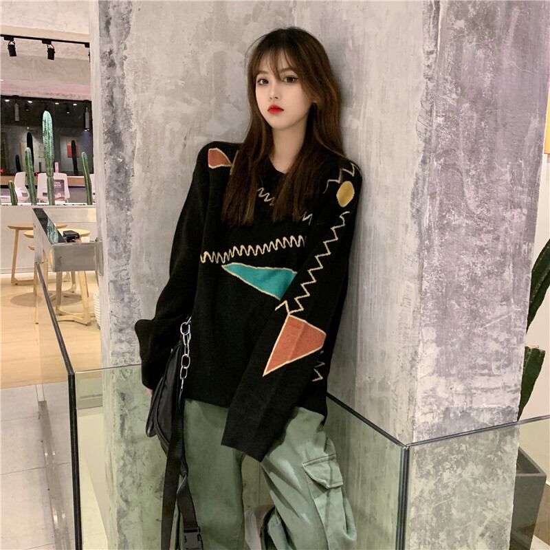 【韓国通販 dgo】retro round neck pullover sweater black color(A0932)