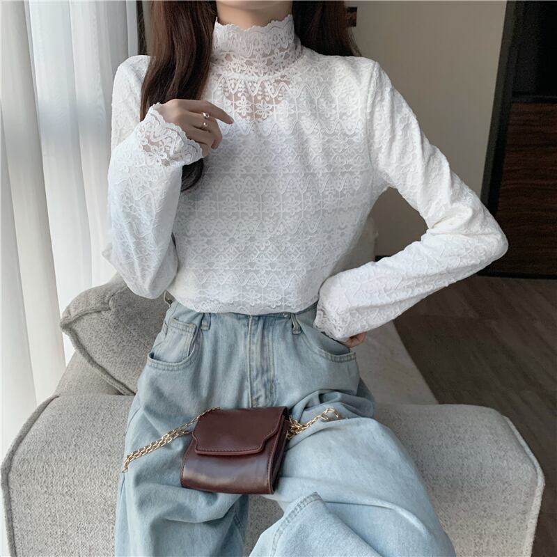 【韓国通販 dgo】half high collar elegant lace shirt 3colors(A0898)