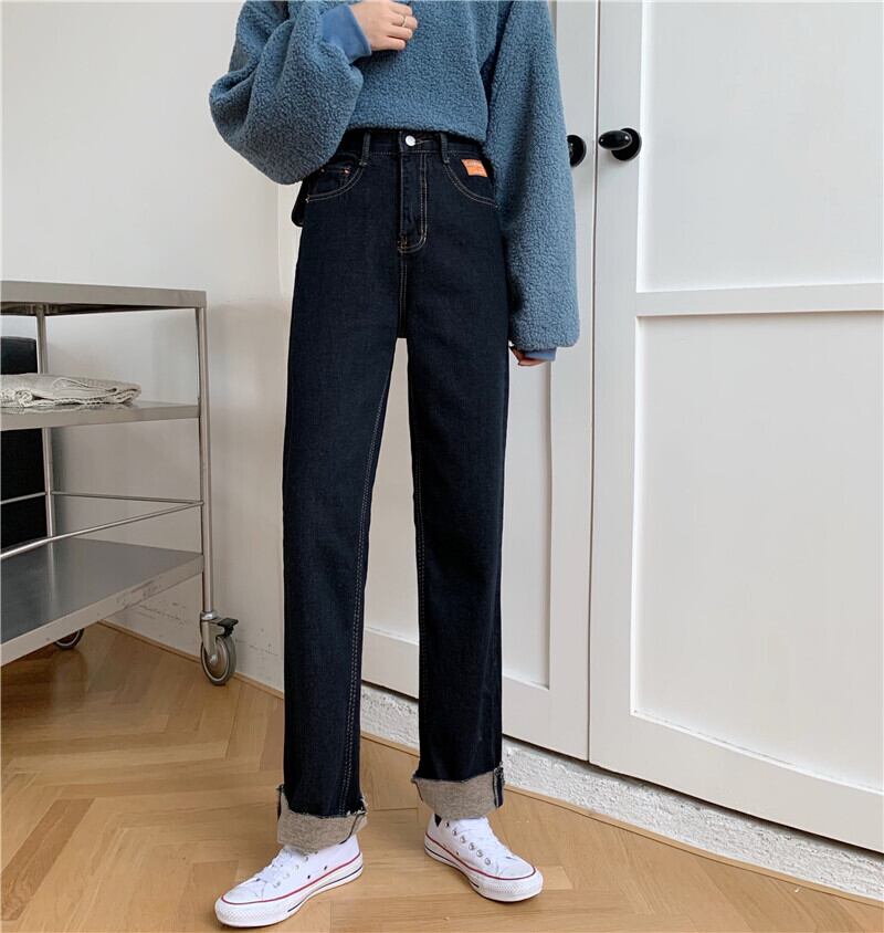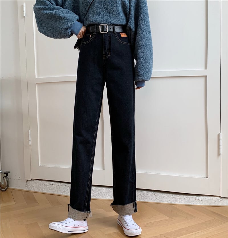 【韓国通販 dgo】high-waist straight jeans plus velvet black color(A0873)
