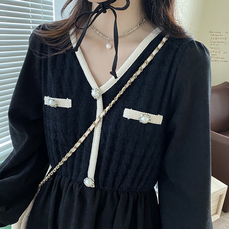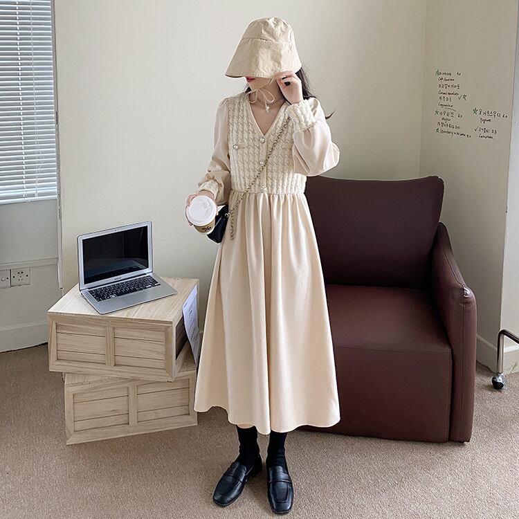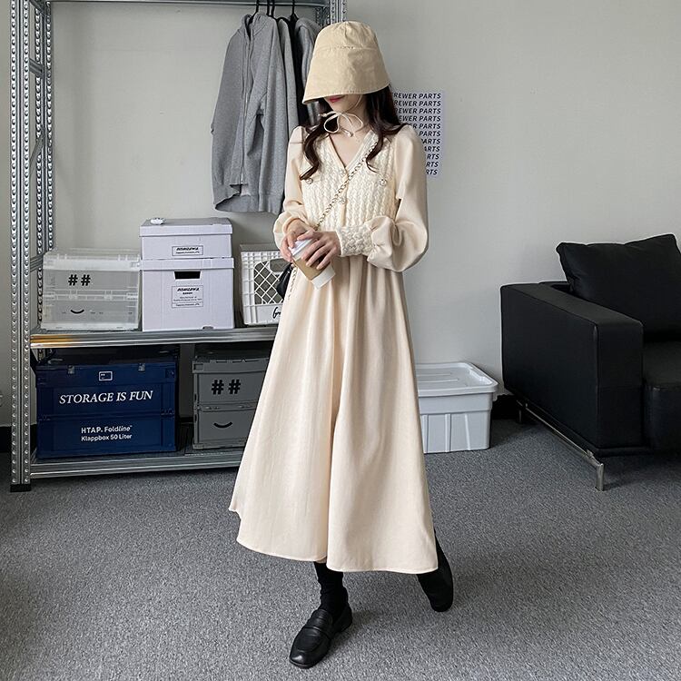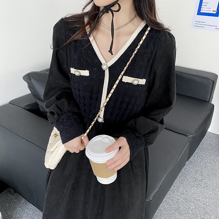 【韓国通販 dgo】middle-length v-neck one-piece dress plus velvet 2color(A0861)