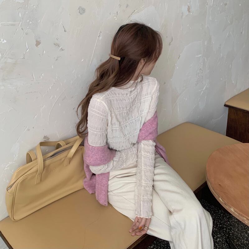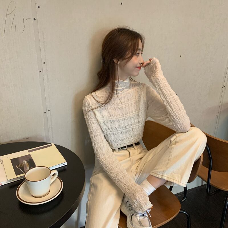 【韓国通販 dgo】half high neck long sleeve lace shirt apricot color(A0796)