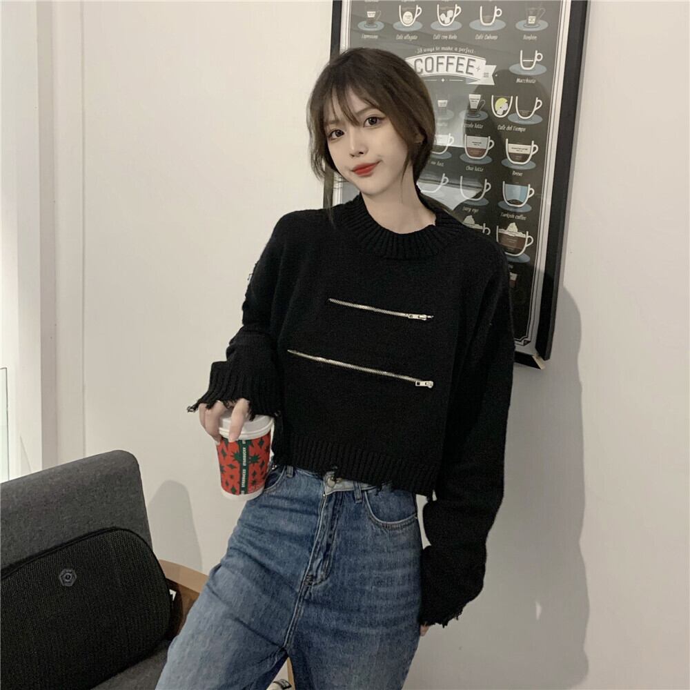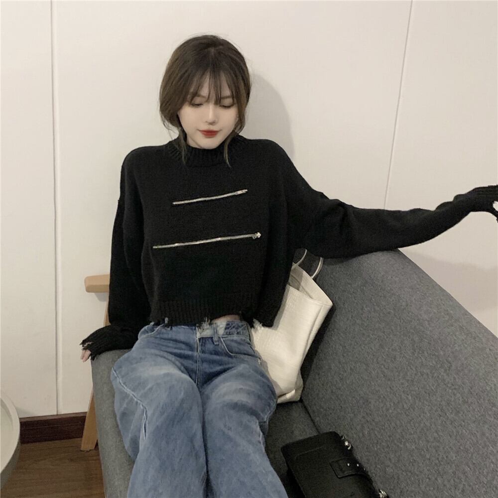 【韓国通販 dgo】round neck short length sweater black color(A0676)