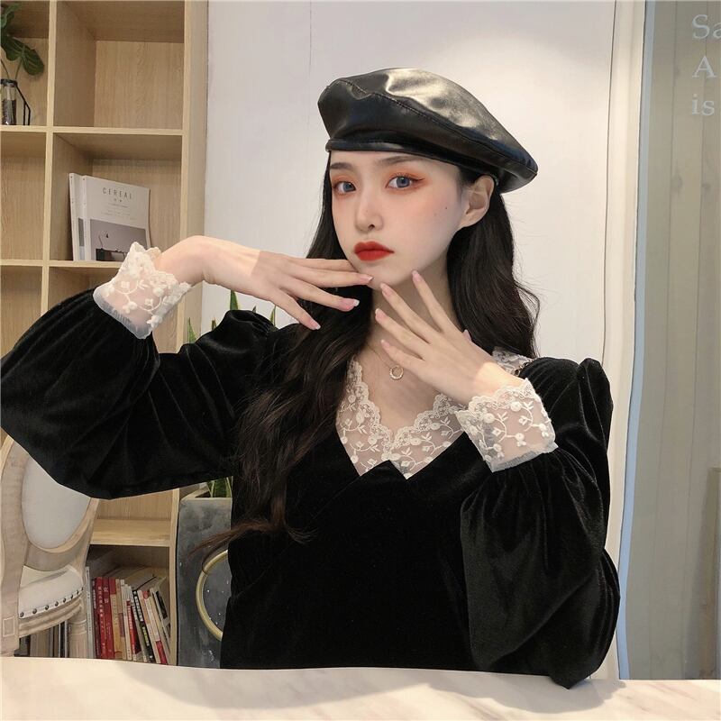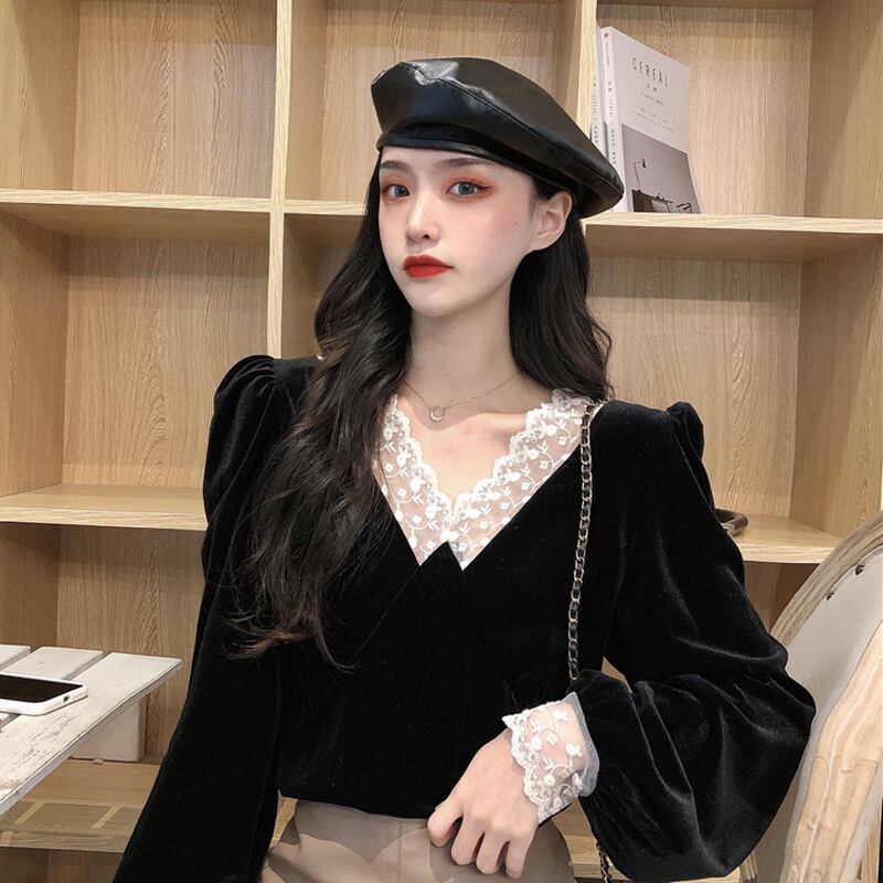 【韓国通販 dgo】retro v-neck long sleeve blouse 2colors(A0675)