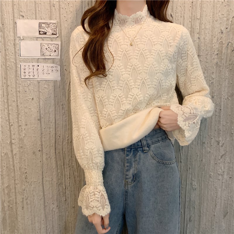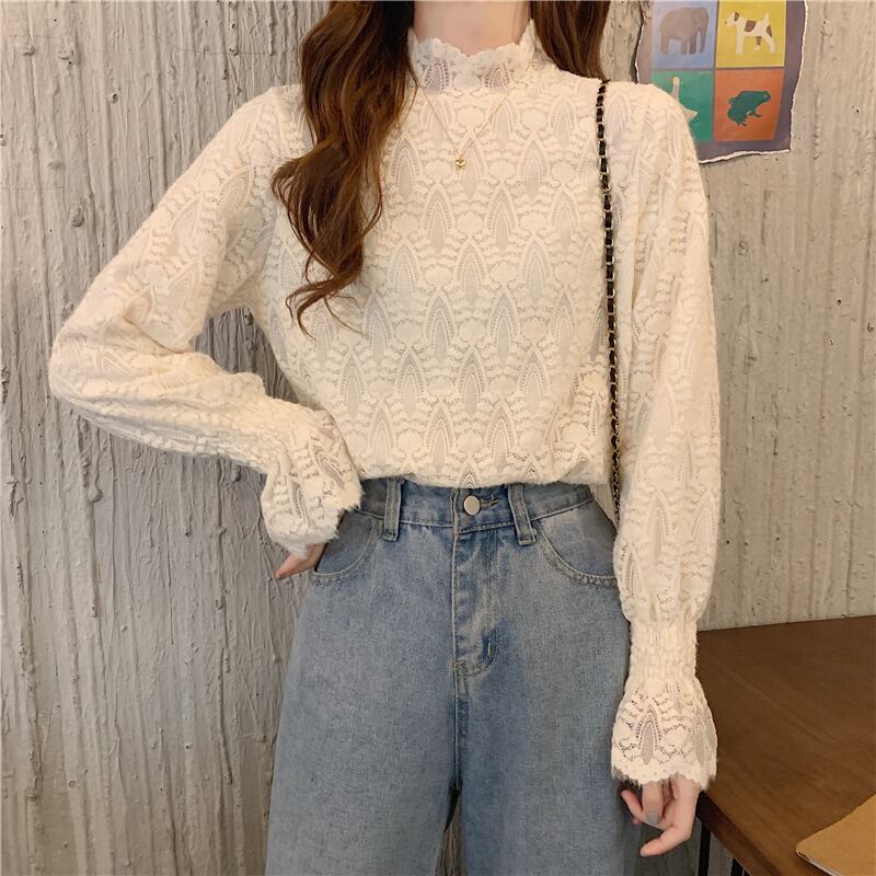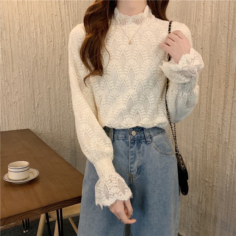 【韓国通販 dgo】half high neck trumpet sleeve lace shirt 2colors(A0672)