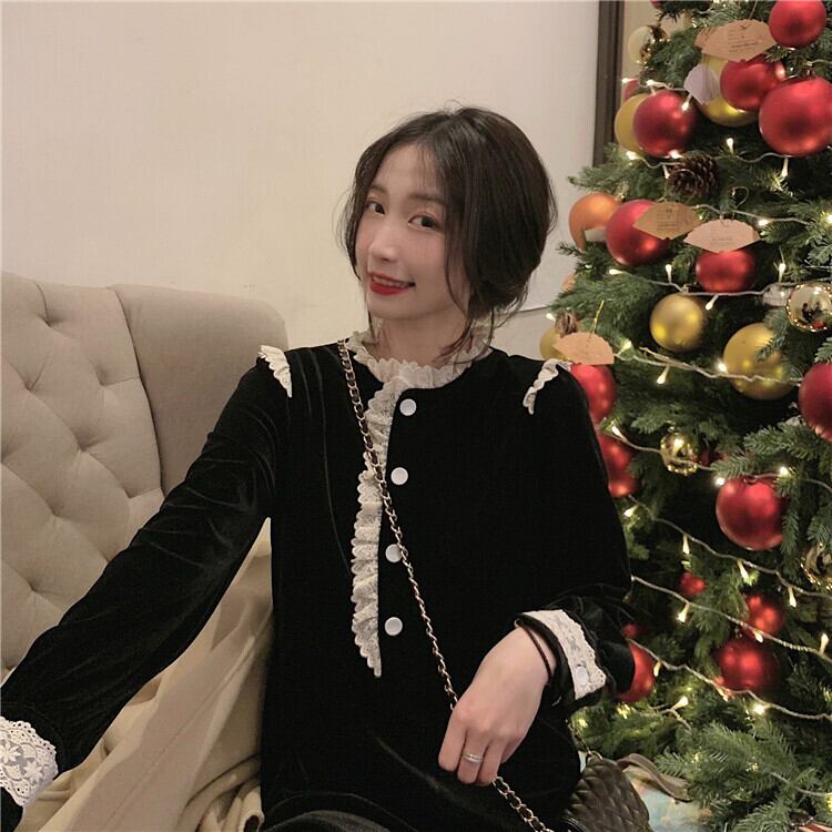 【韓国通販 dgo】retro high-waist velvet dress black color(A0659)