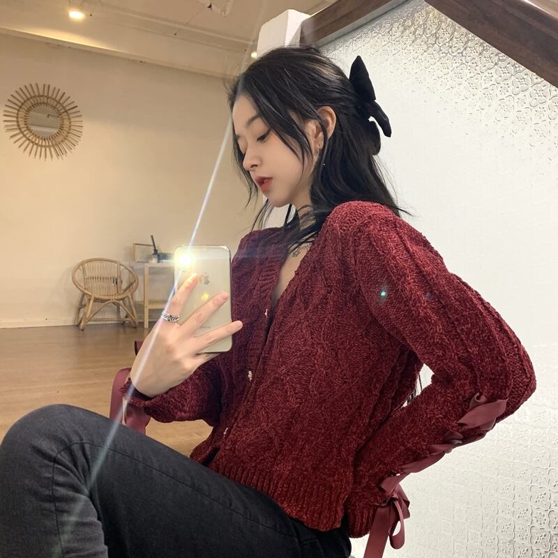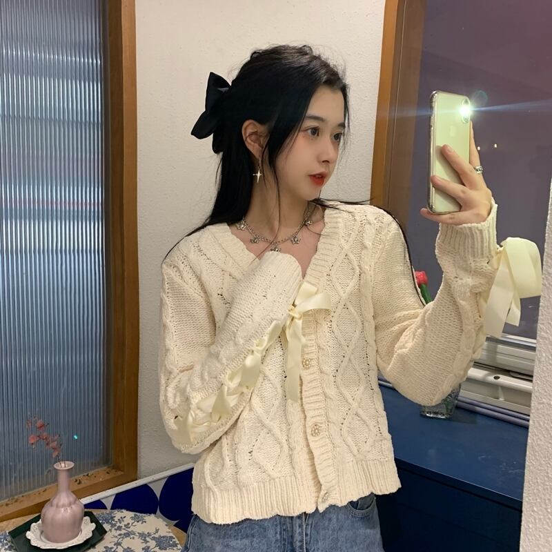 袖口にあしらわれたリボンが特徴的なセーターです。