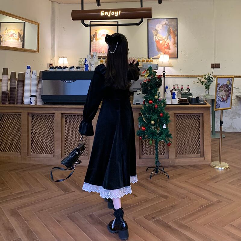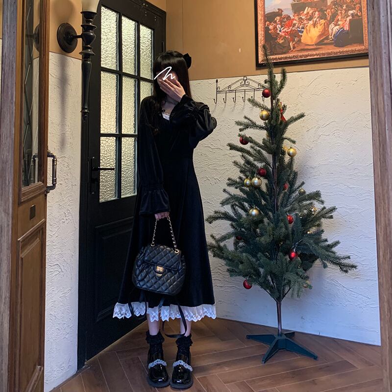 【韓国通販 dgo】square neck velvet one-piece dress black color(A0596)