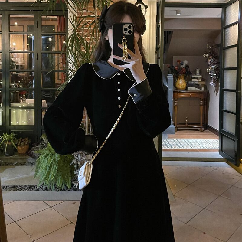 【韓国通販 dgo】retro middle-length velvet black one-piece dress(A0556)