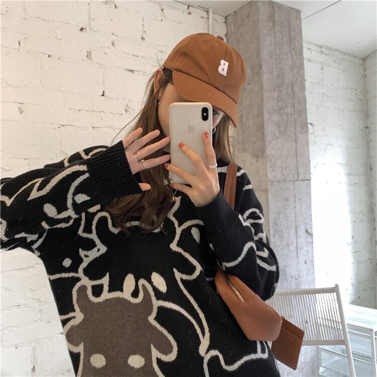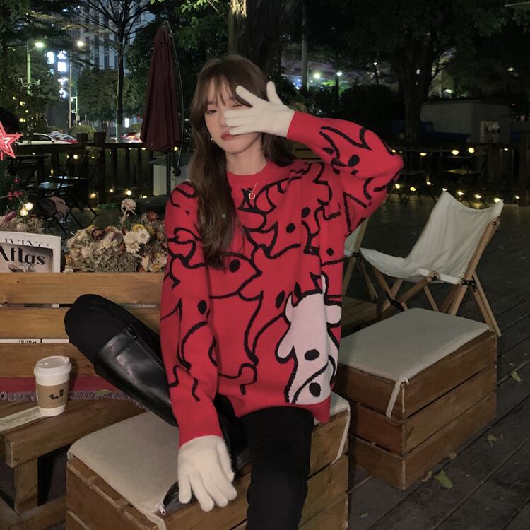 【韓国通販 dgo】cow design round neck sweater 2colors(A0558)