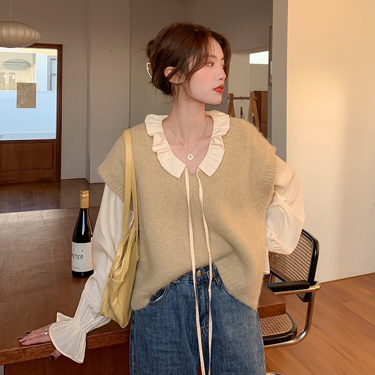 【韓国通販 dgo】long sleeve sweet tops + sleeveless knit vest(A0457)