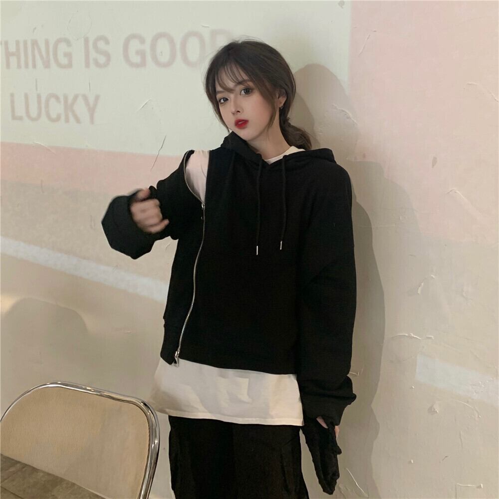 【韓国通販 dgo】hooded irregular zipper tops black color(A0452)