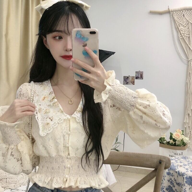 【韓国通販 dgo】doll neck lace cropped tops(A0402)