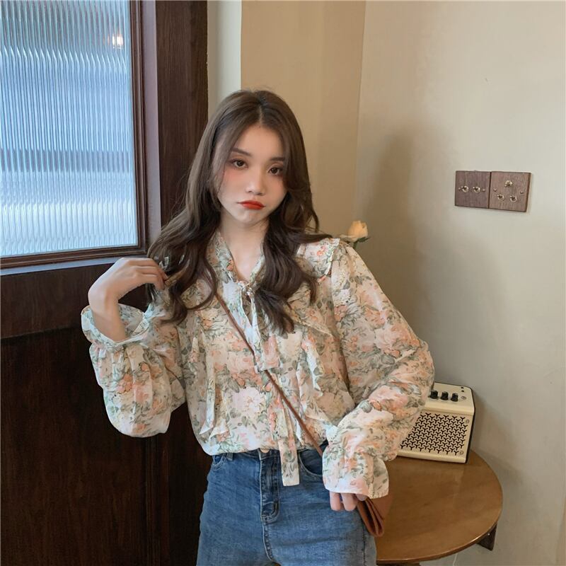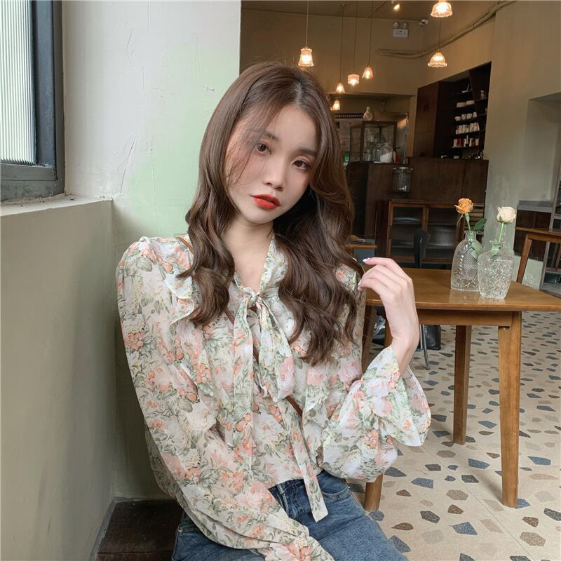 【韓国通販 dgo】retro v-neck floral chiffon tops(A0044)