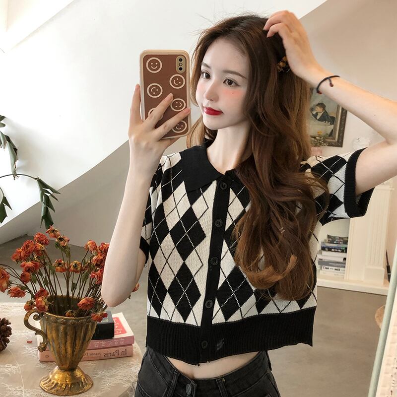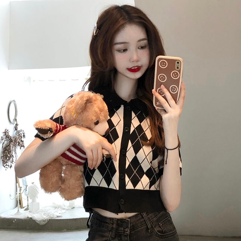 【韓国通販 dgo】diamond checked short knit tops (B0772)