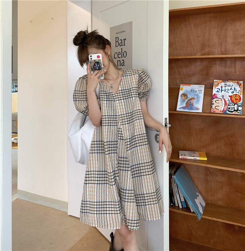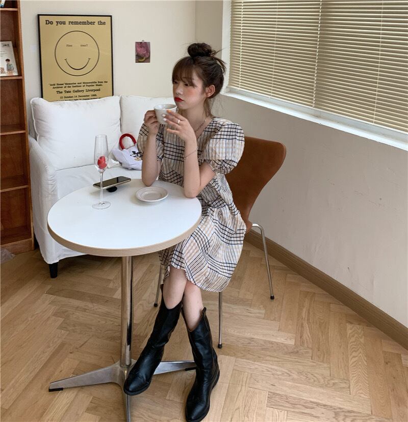 【韓国通販 dgo】french retro v-neck checked dress(B0771)