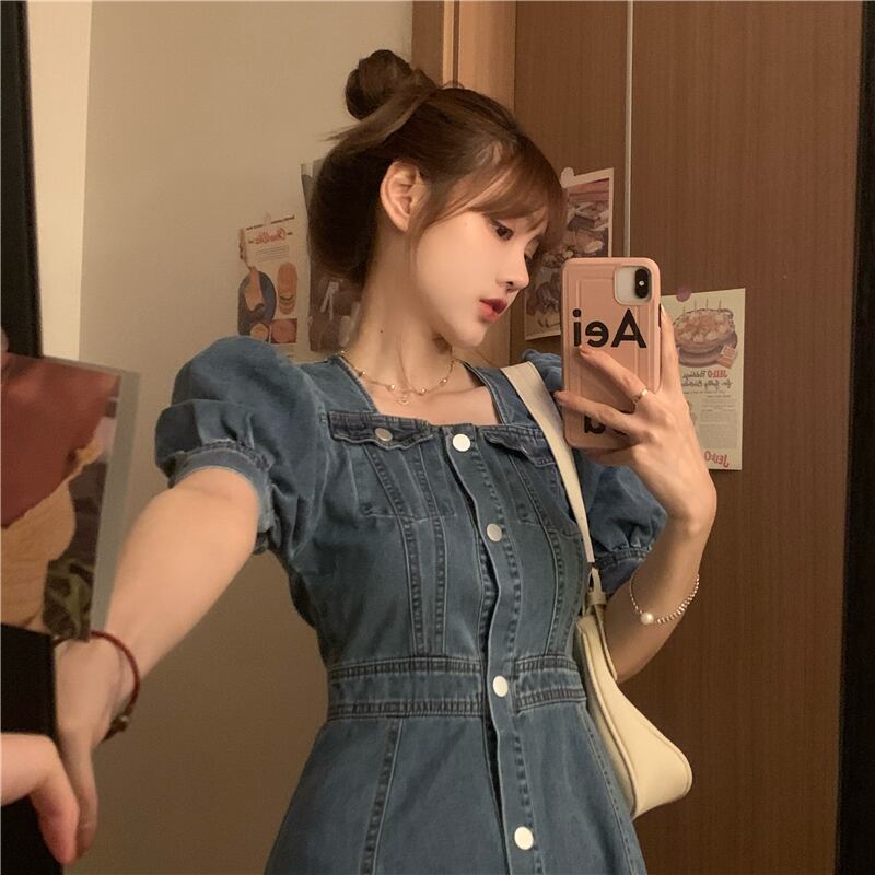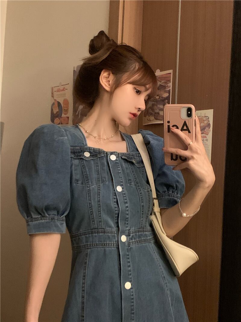 【韓国通販 dgo】retro puff sleeve high-waist denim dress(B0766)