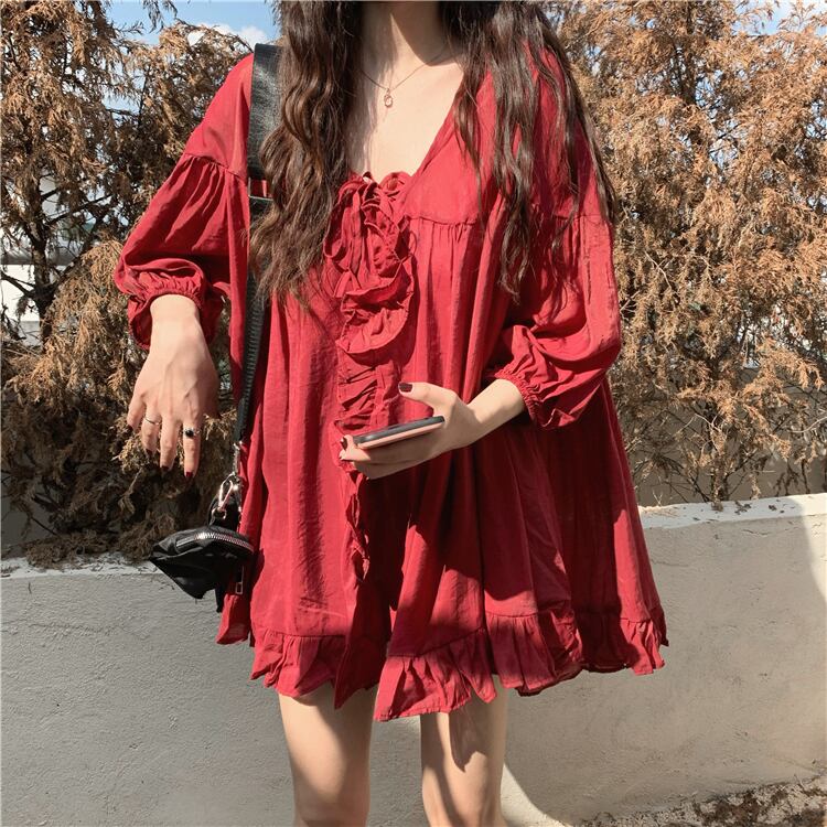 【韓国通販 dgo】v-neck puff sleeve dress(B0809)