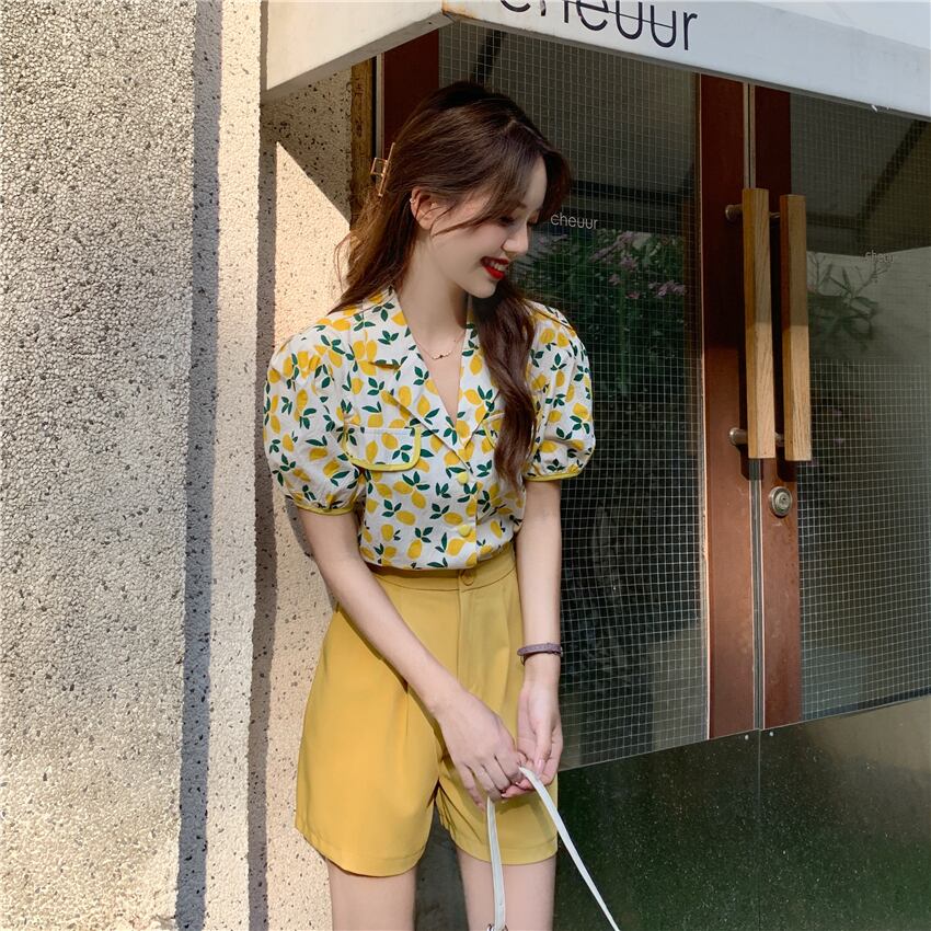 花柄シャツとカラーショートパンツのセット商品です。