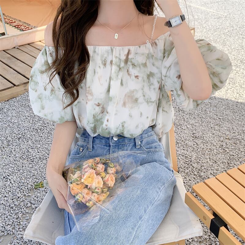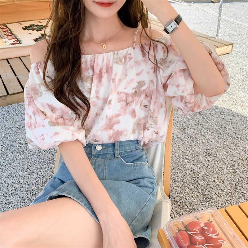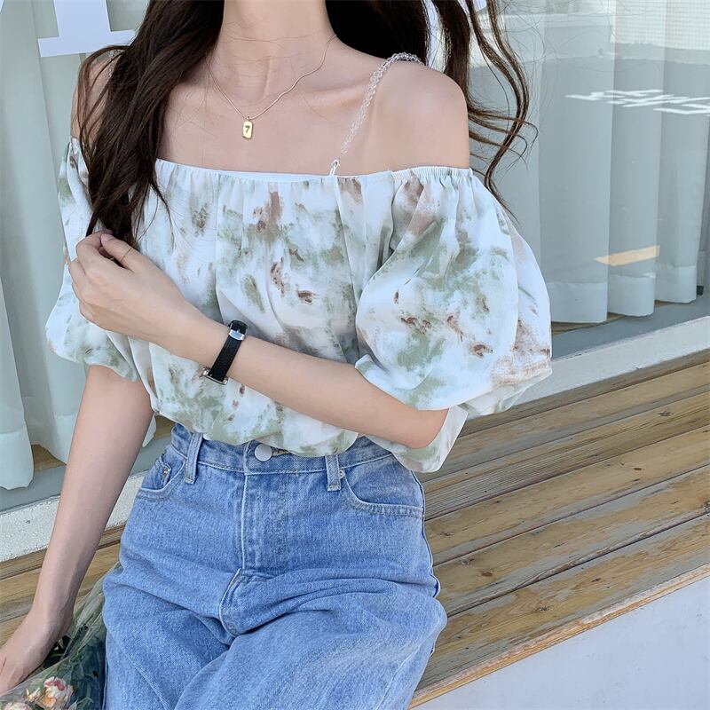 マーブル柄が可愛いオフショルダーのトップスです。ショルダーは取り外し可能なので2wayで使えます♪ワンショルダーは程よい肌見せで涼しげな印象になりこれからの夏にピッタリのアイテム!シンプルなボトムスやスカートと相性抜群です?