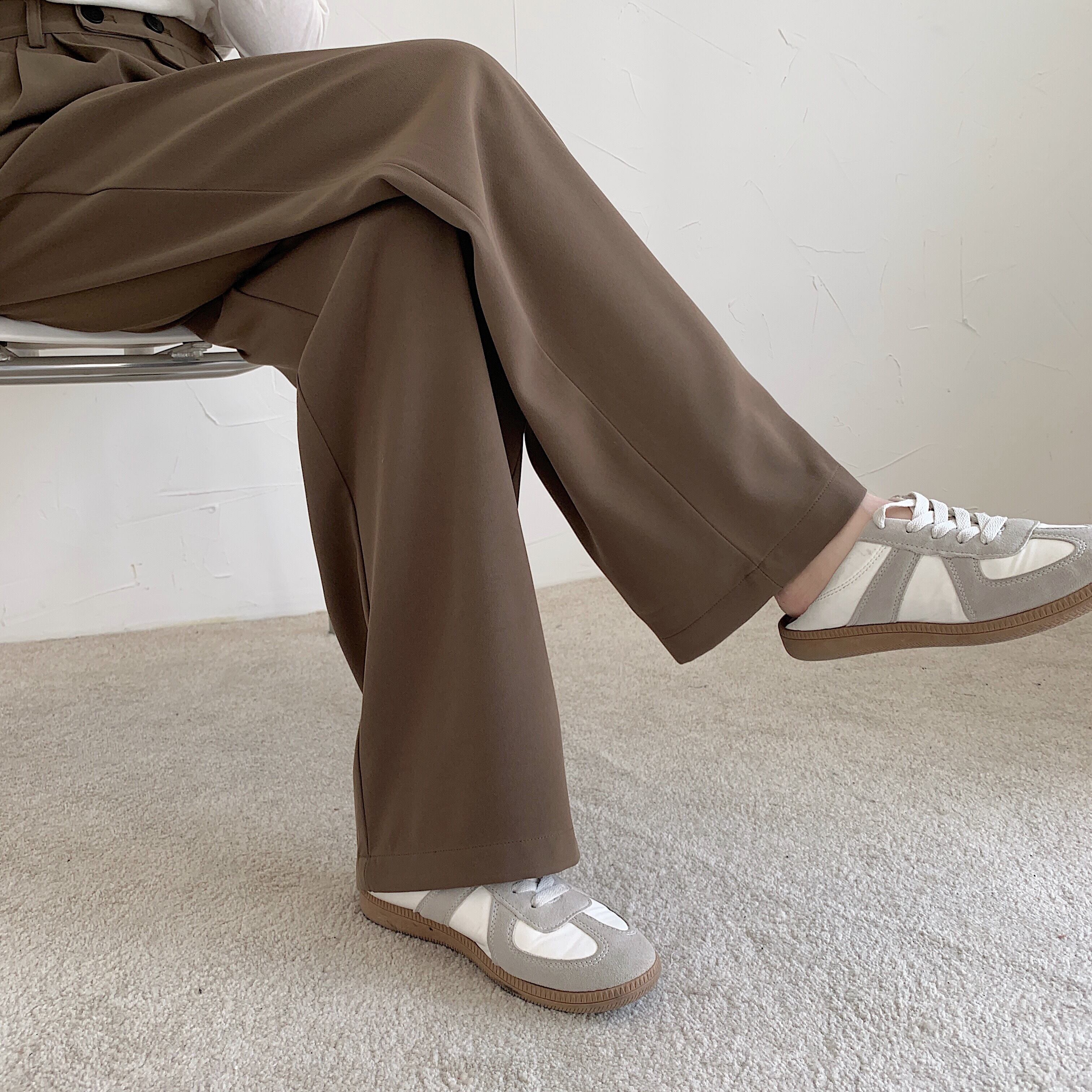 スーツパンツのようなストレートのシルエットで綺麗見えするのはもちろん、ゆったりとしたデザインで抜け感のある印象に♪