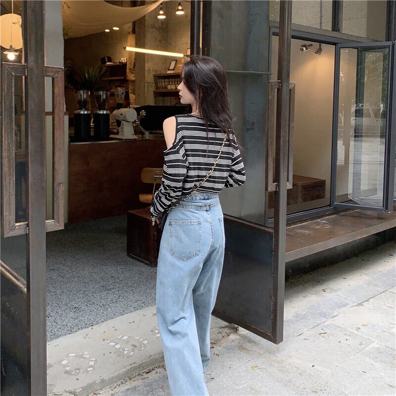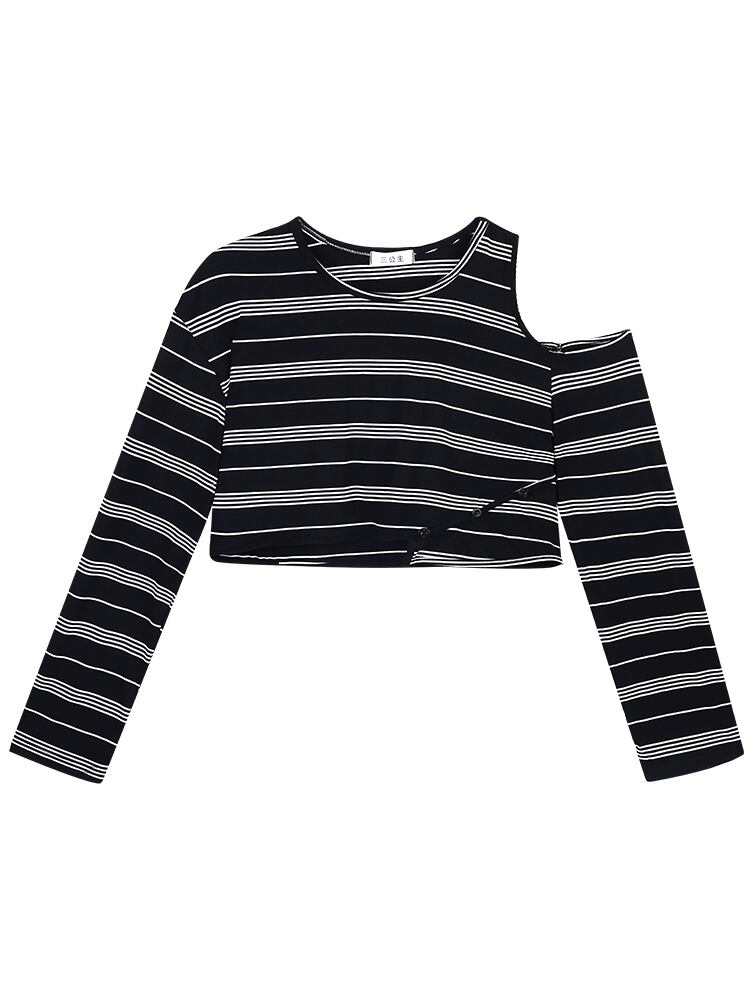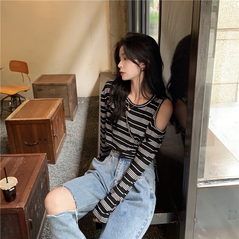 【韓国通販 dgo】off-shoulder stripe black tops (B1079)