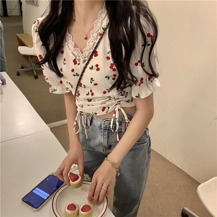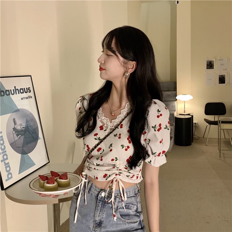 【韓国通販 dgo】v-neck cherry design short tops (B1127)