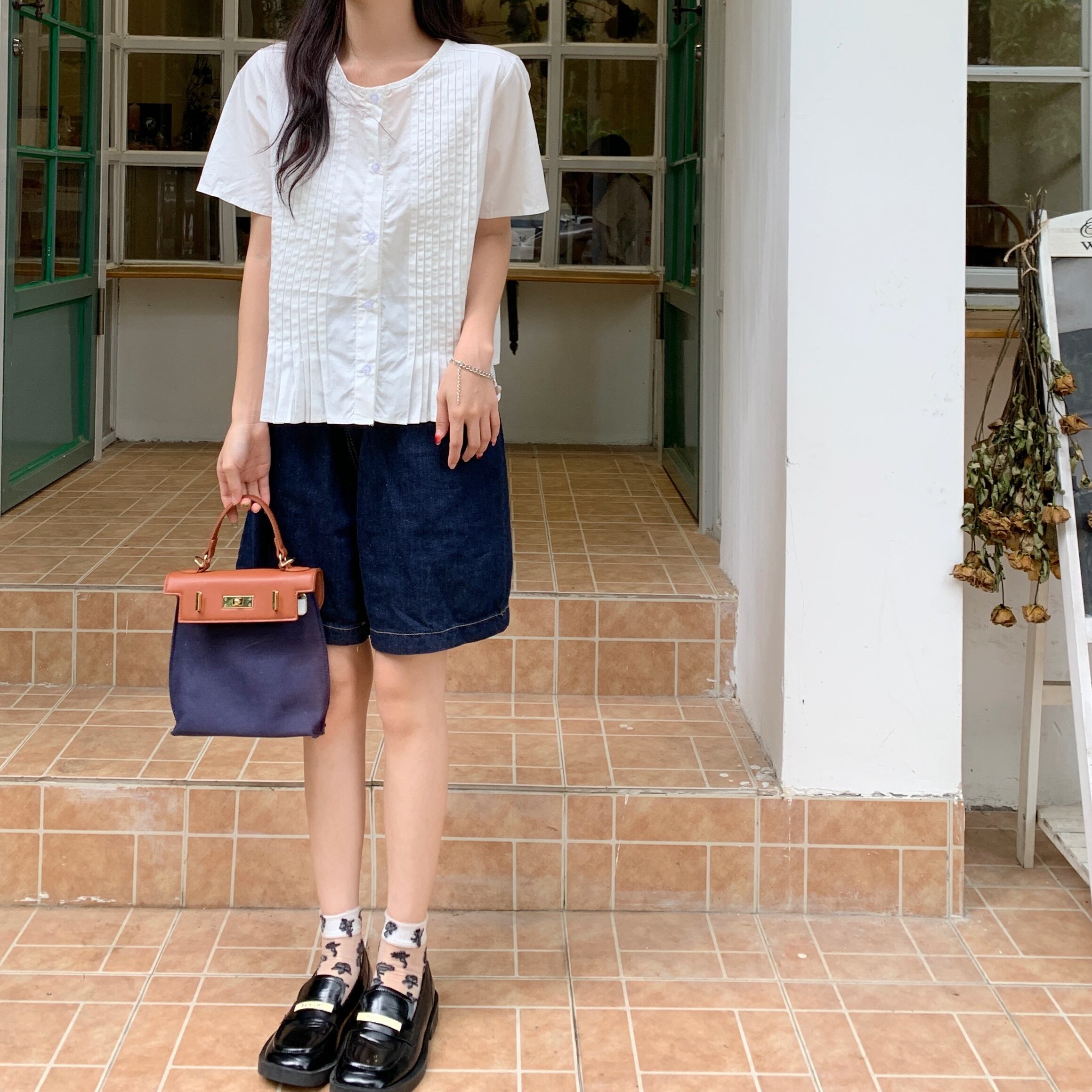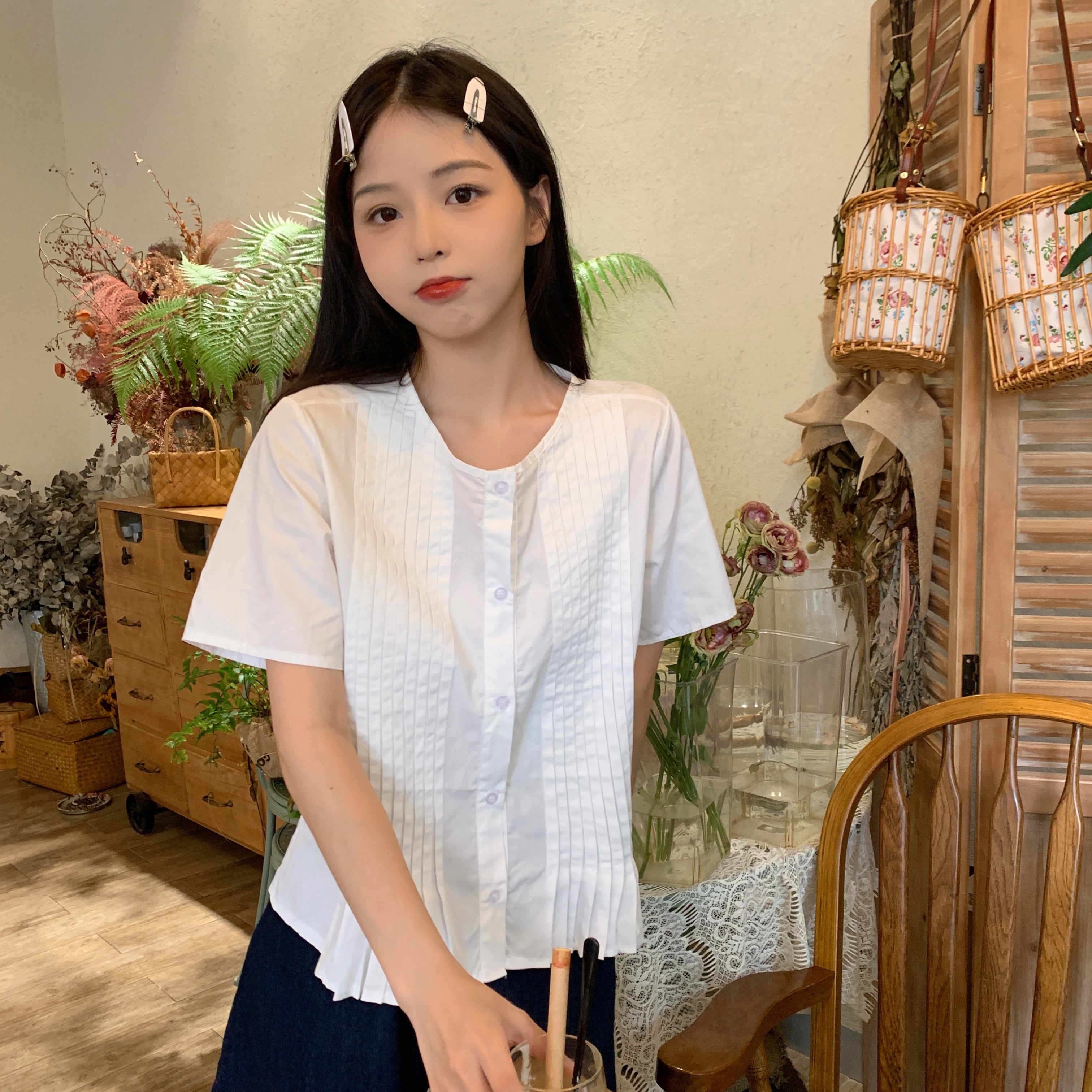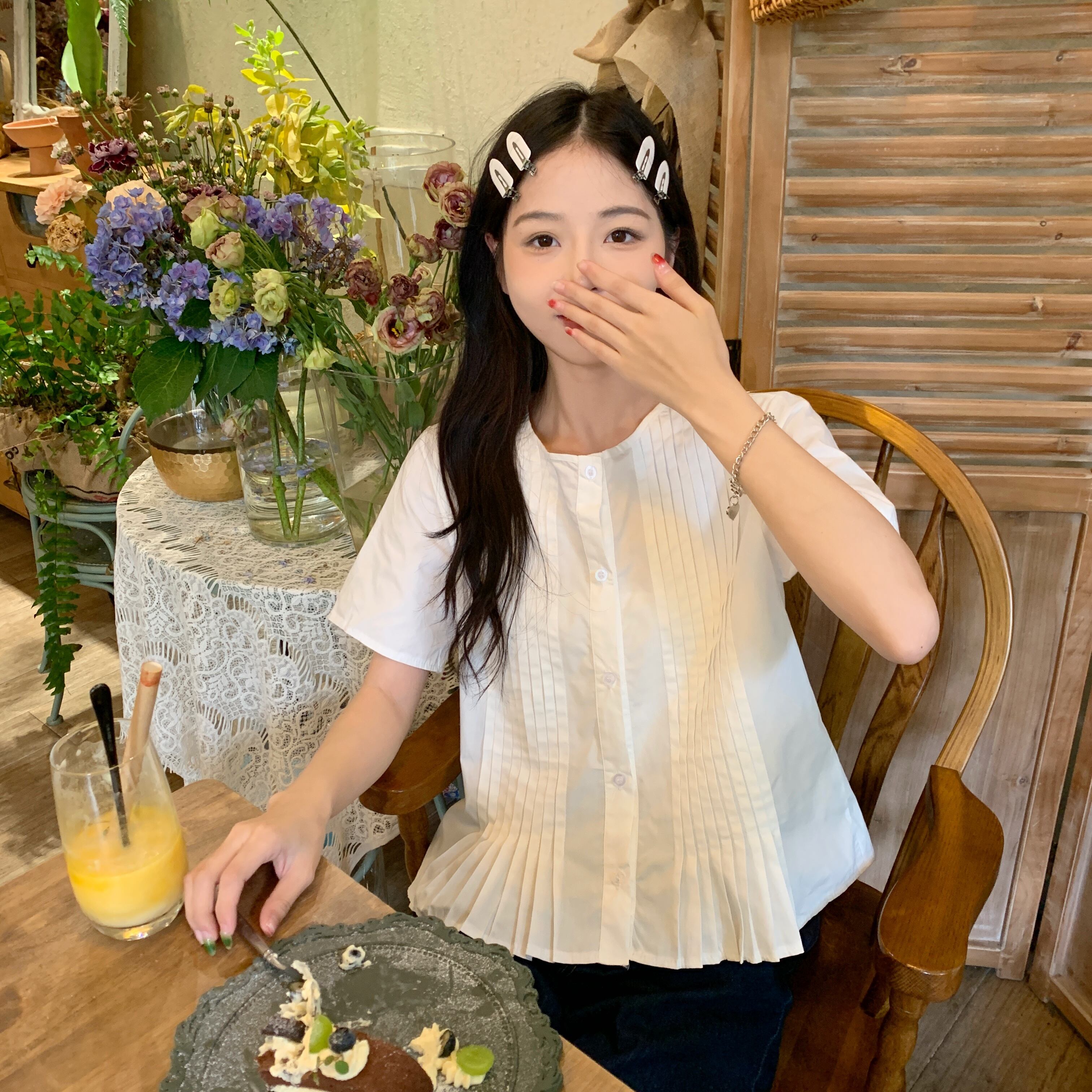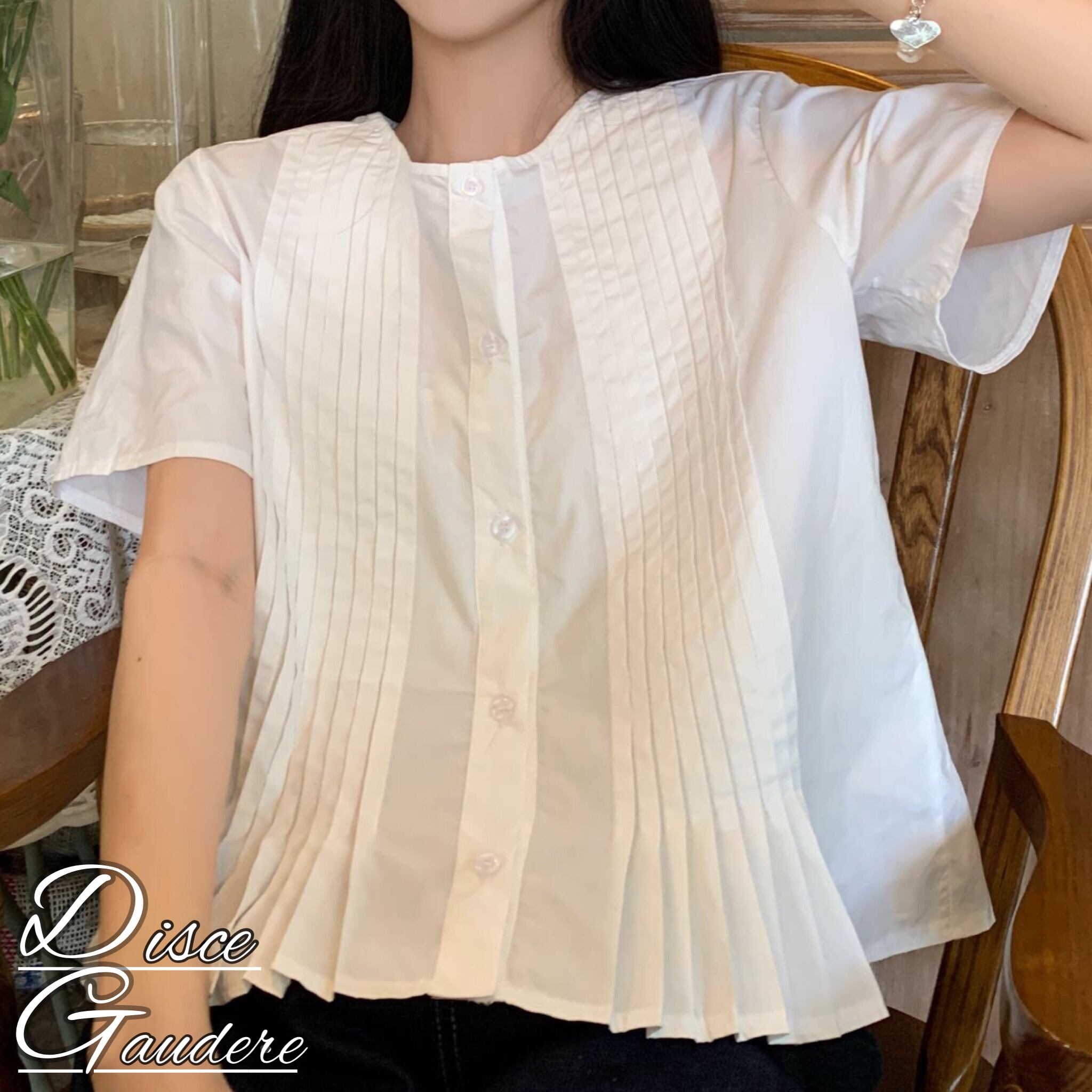 【韓国通販 dgo】round neck Pleated white shirt(B1147)