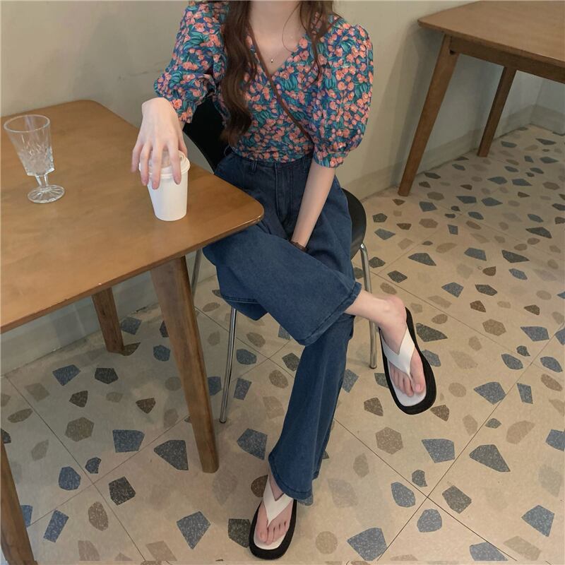 【韓国通販 dgo】floral v-neck tops + high-waist jeans two-piece(B1186)