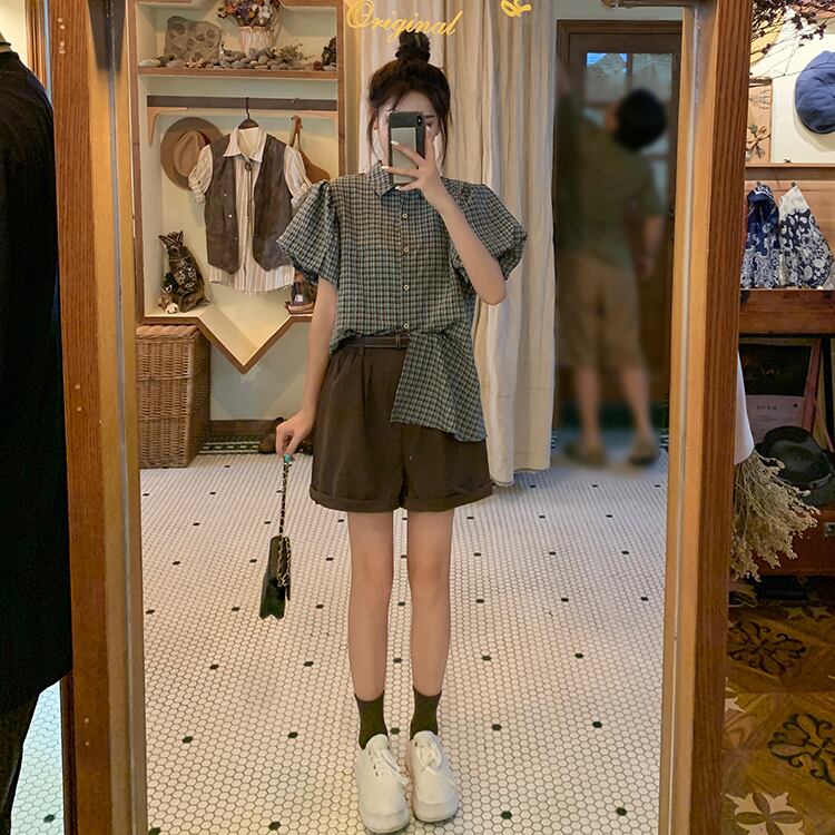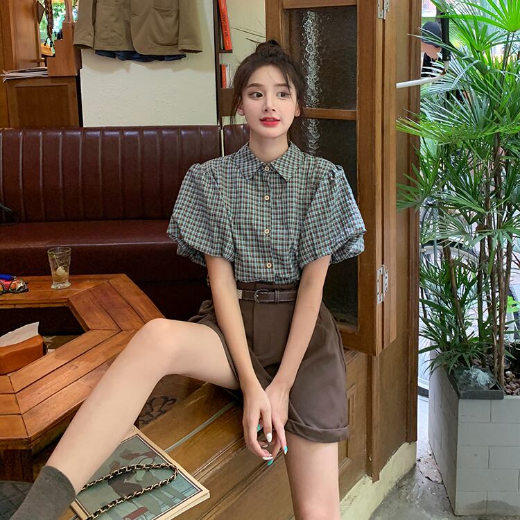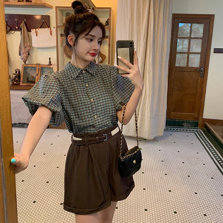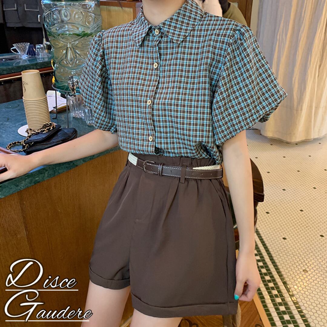 【韓国通販 dgo】puff sleeve checked shirt and wide-leg short pants(B1210)