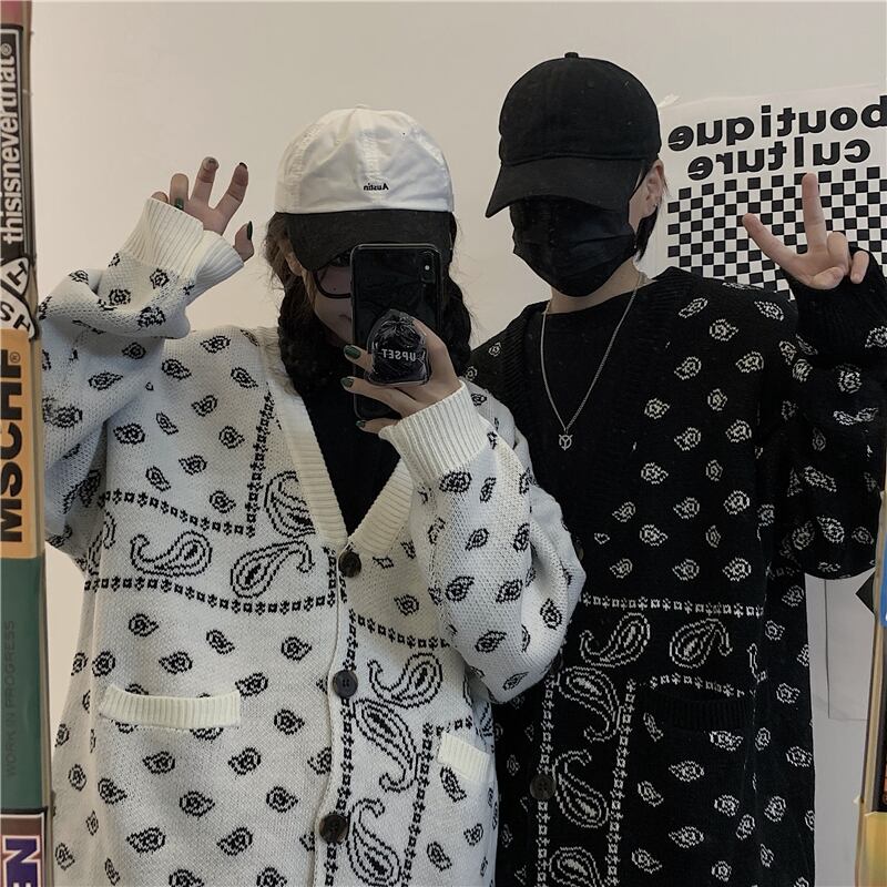 【韓国通販 dgo】ストリートVネックニットカーディガン ユニセックス ホワイト/ブラック(M1411)